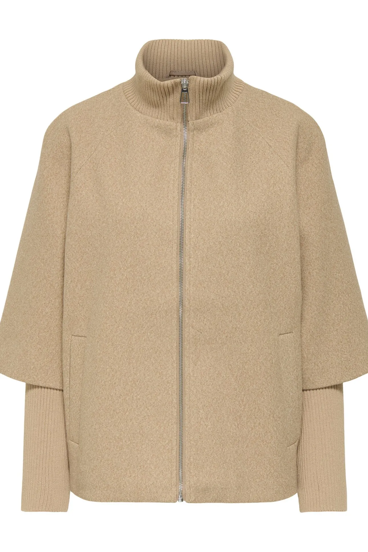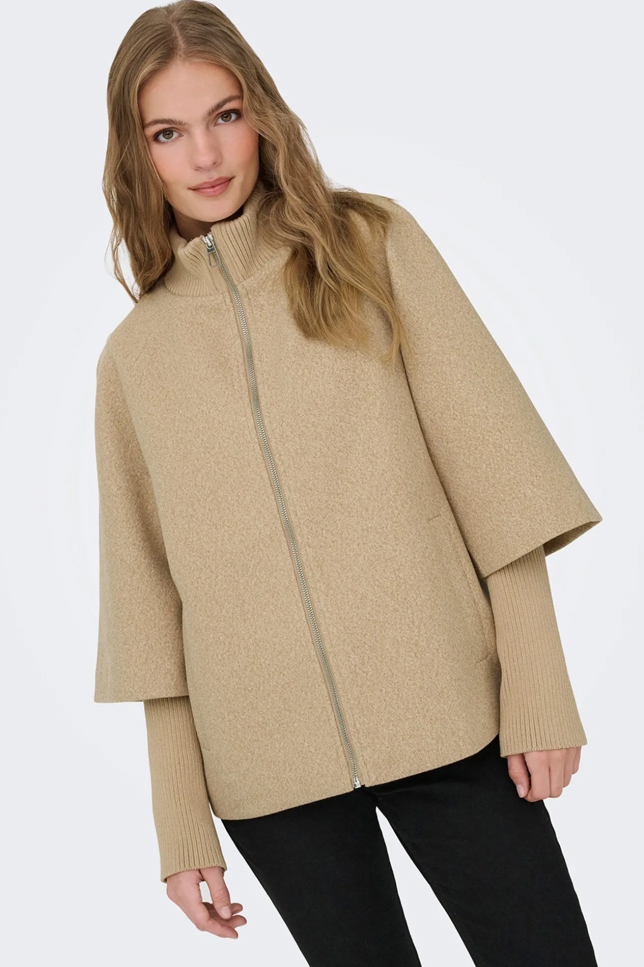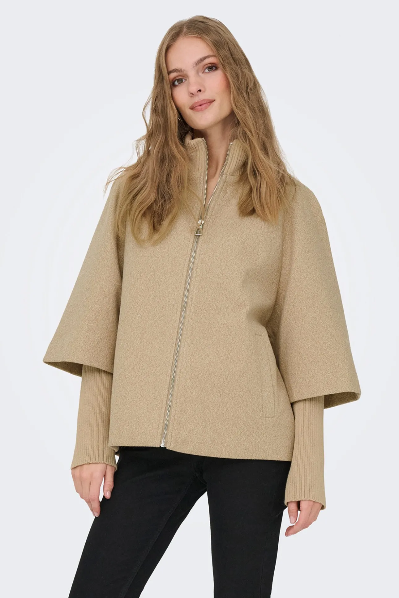 – Corte holgado, manga larga amplia tipo capa con puños de punto ajustados, cuello alto acanalado, cierre de cremallera metálica frontal y bolsillos laterales.