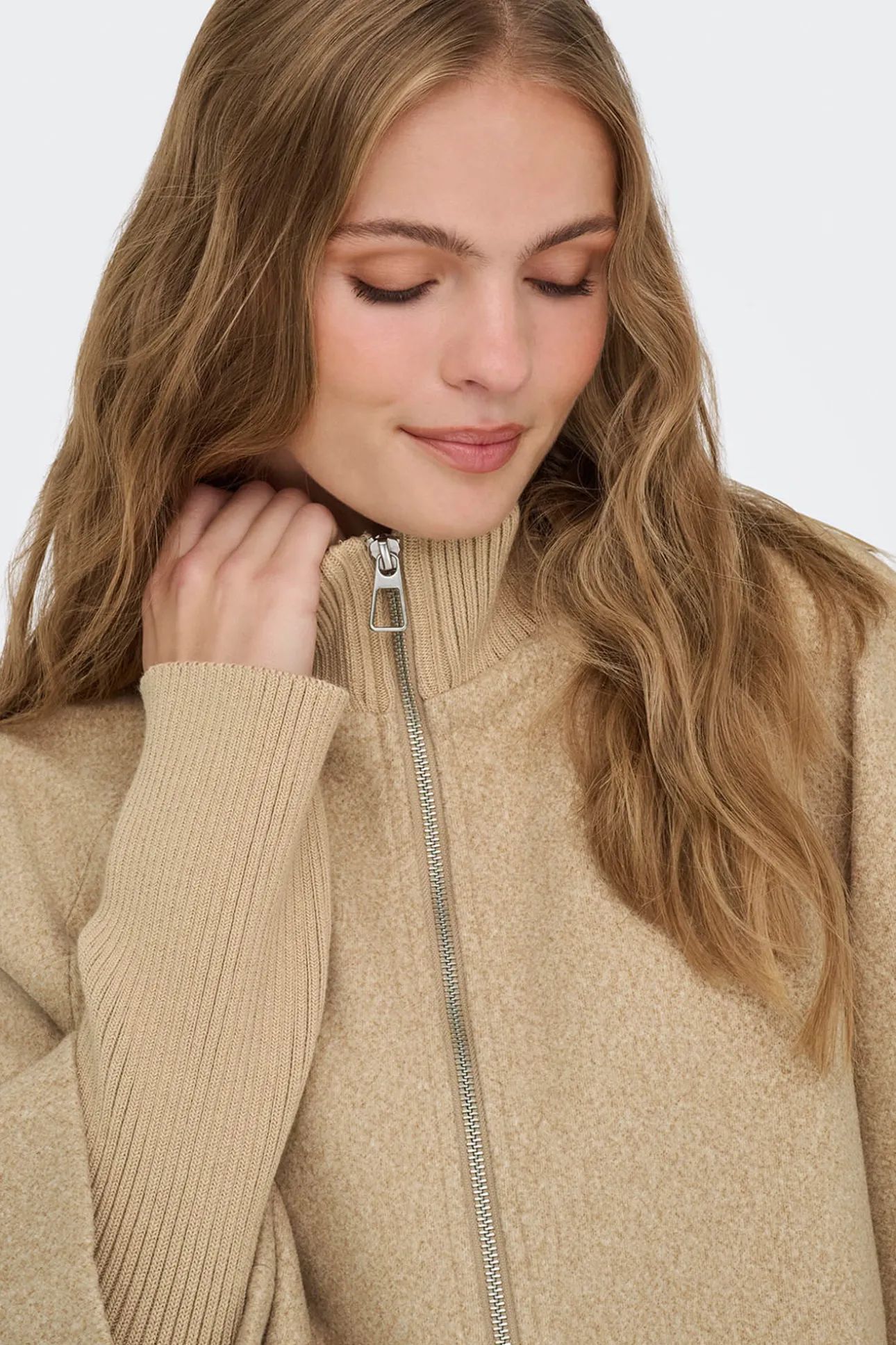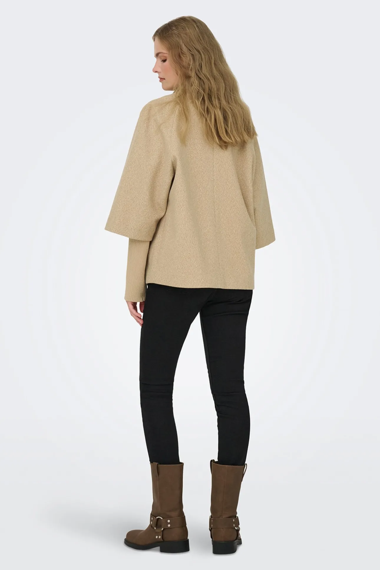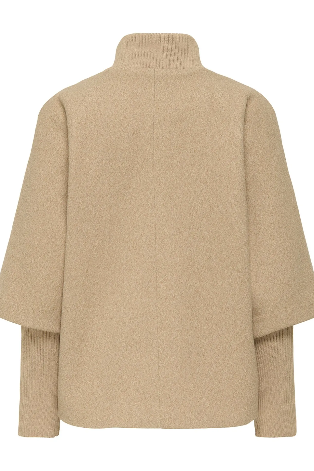 – Corte holgado, manga larga amplia tipo capa con puños de punto ajustados, cuello alto acanalado, cierre de cremallera metálica frontal y bolsillos laterales.