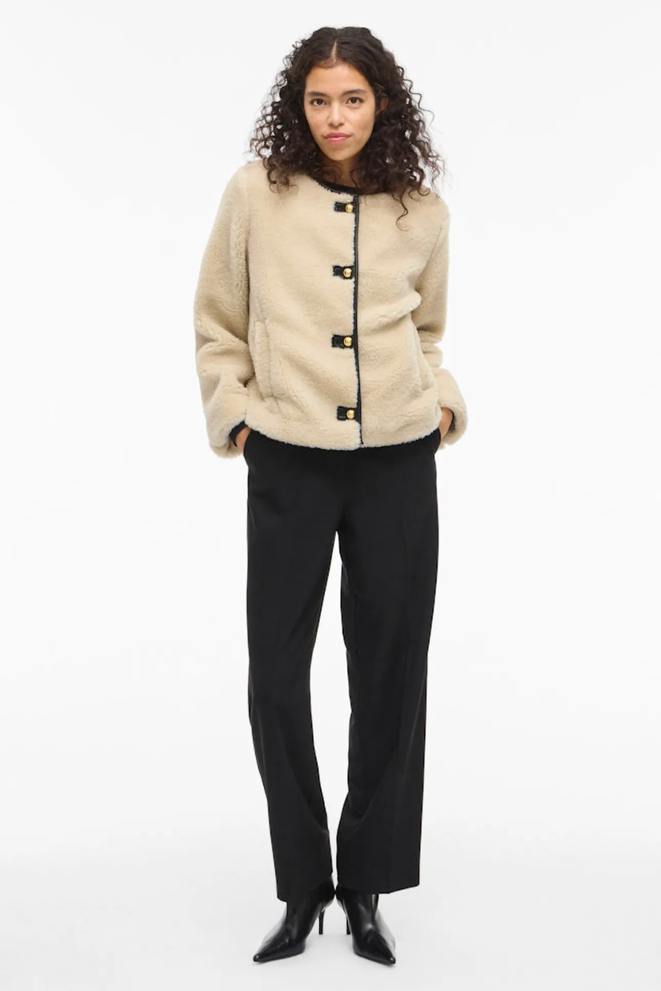 – Cierre frontal con botones redondos dorados