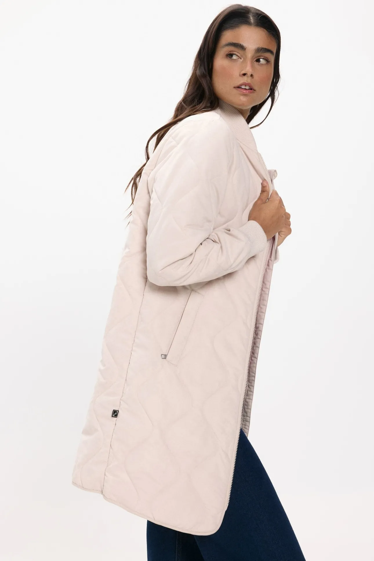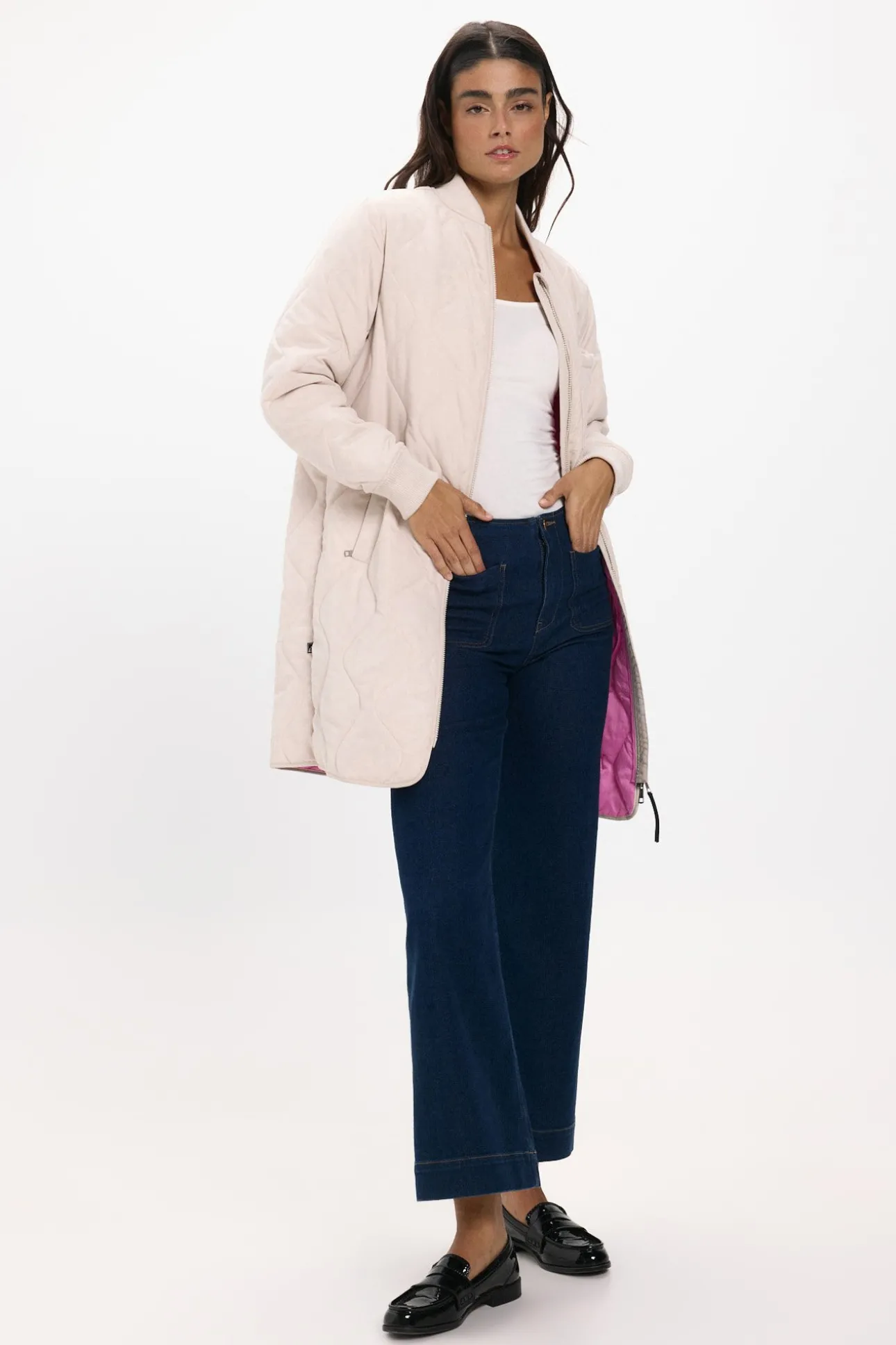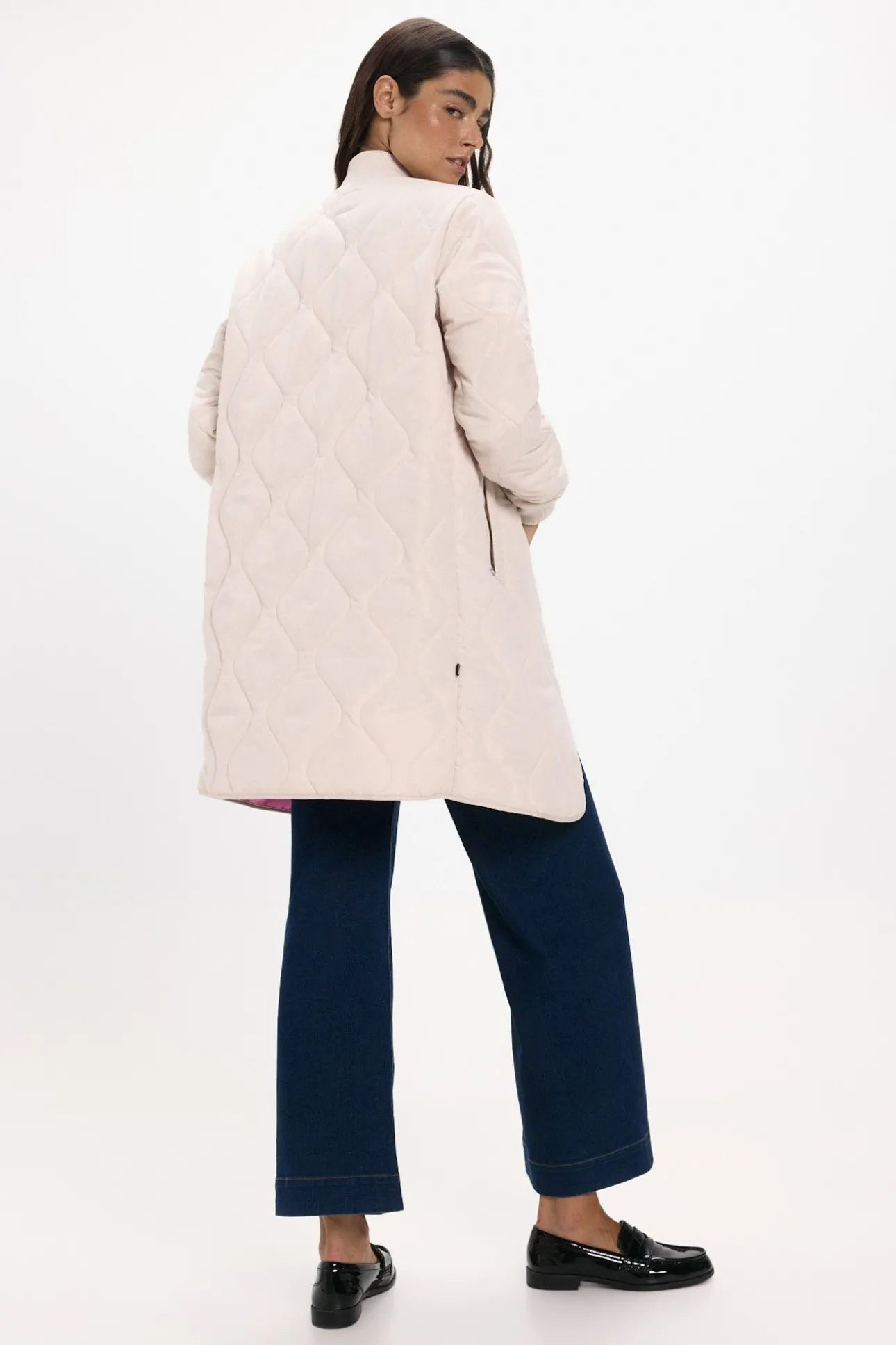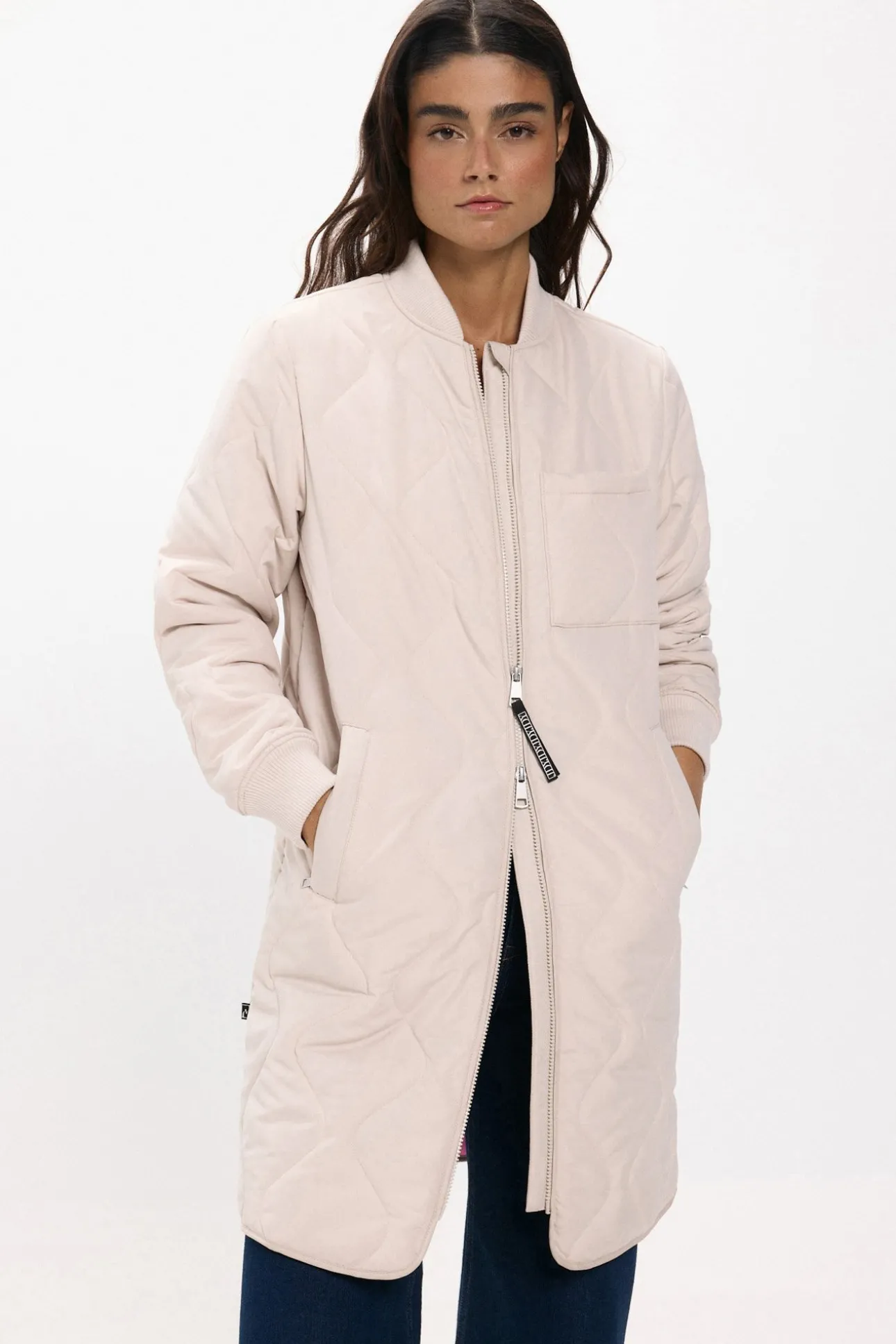 – Estilo bomber, corte recto con patrón ondulado, cuello redondo y puños de canalé, cierre de cremallera frontal completa de doble dirección y bolsillos laterales.