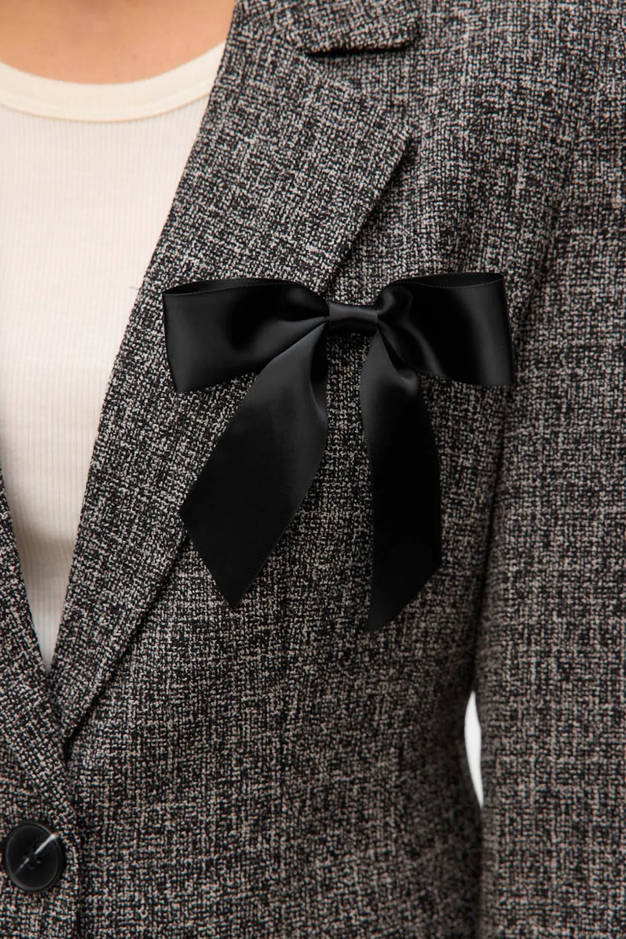 – Detalle de lazo de raso en el pecho.
