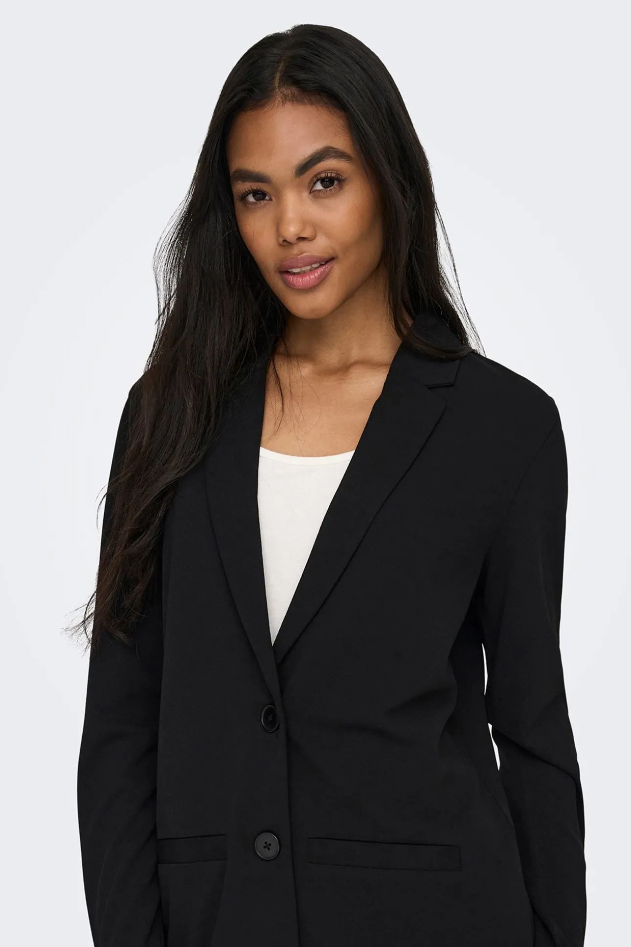 – Corte amplio, manga larga, cuello con solapas, cierre con botones y bolsillos frontales.