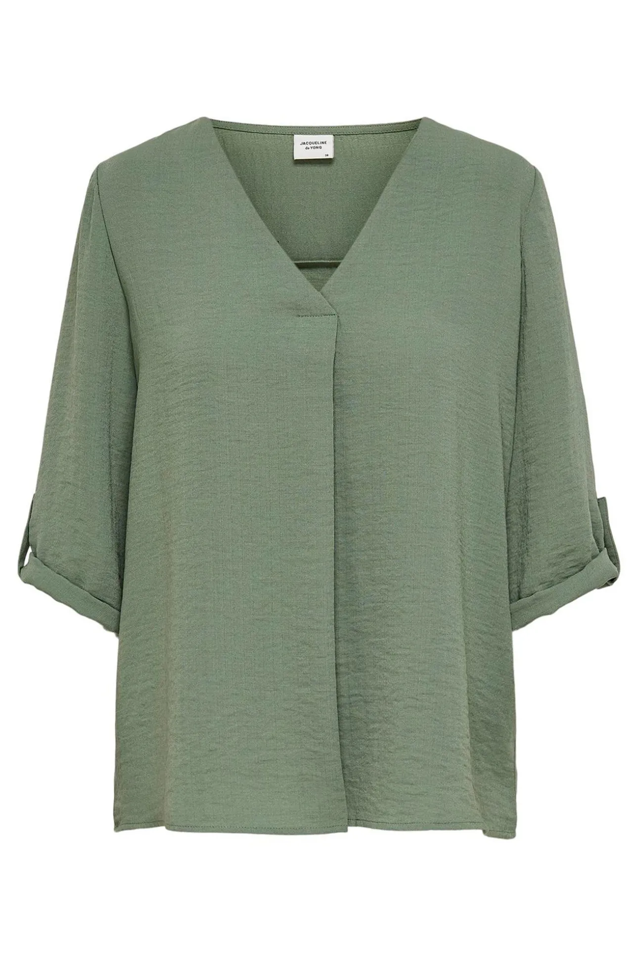 Camisa holgada con escote en V, manga 3/4 y detalle de trabilla con botón en los puños.
