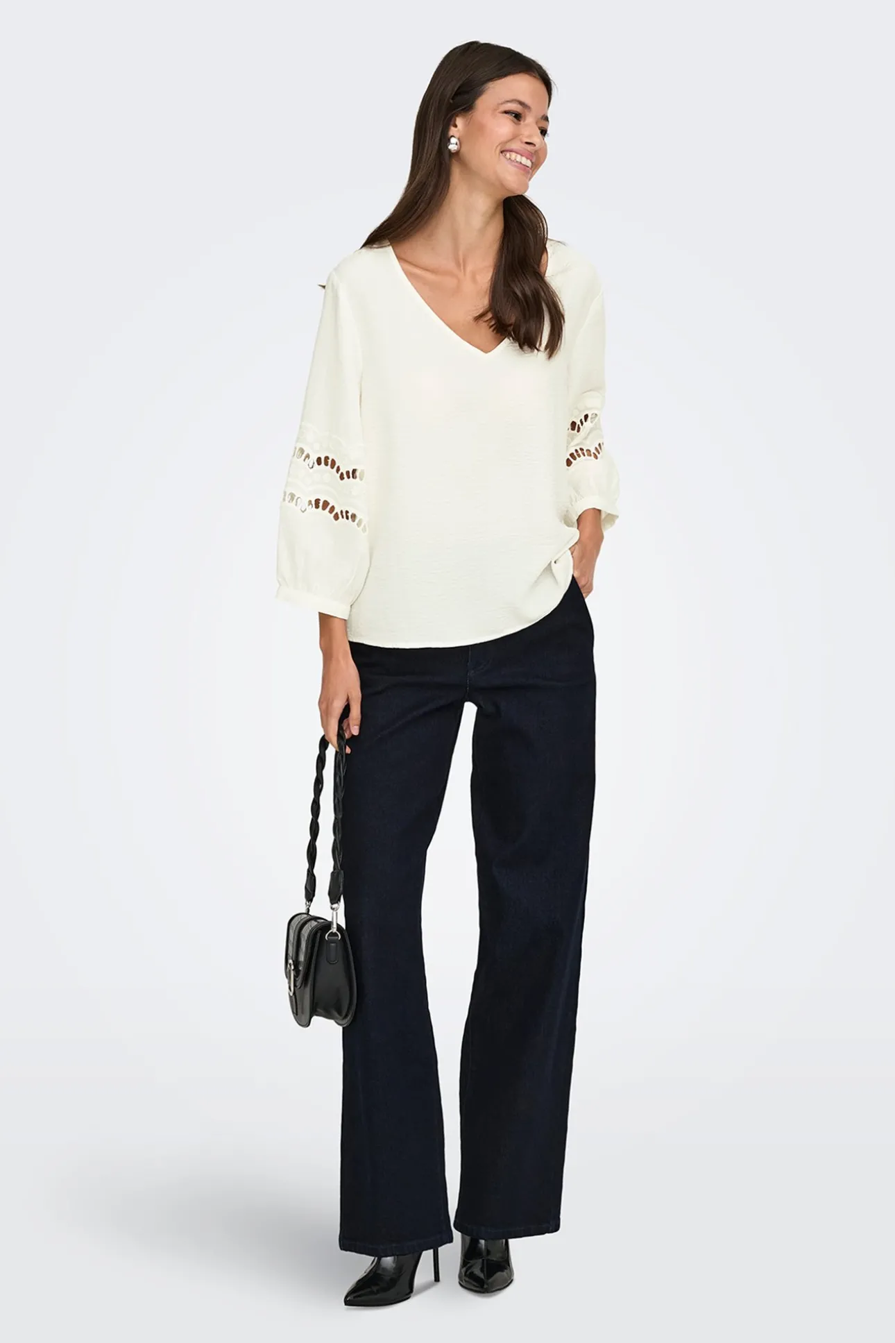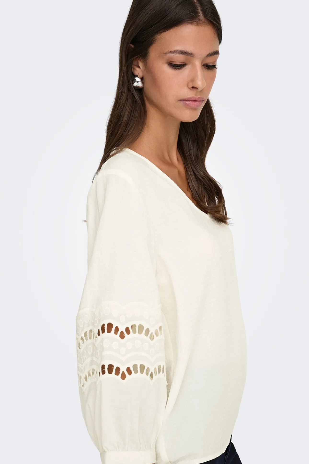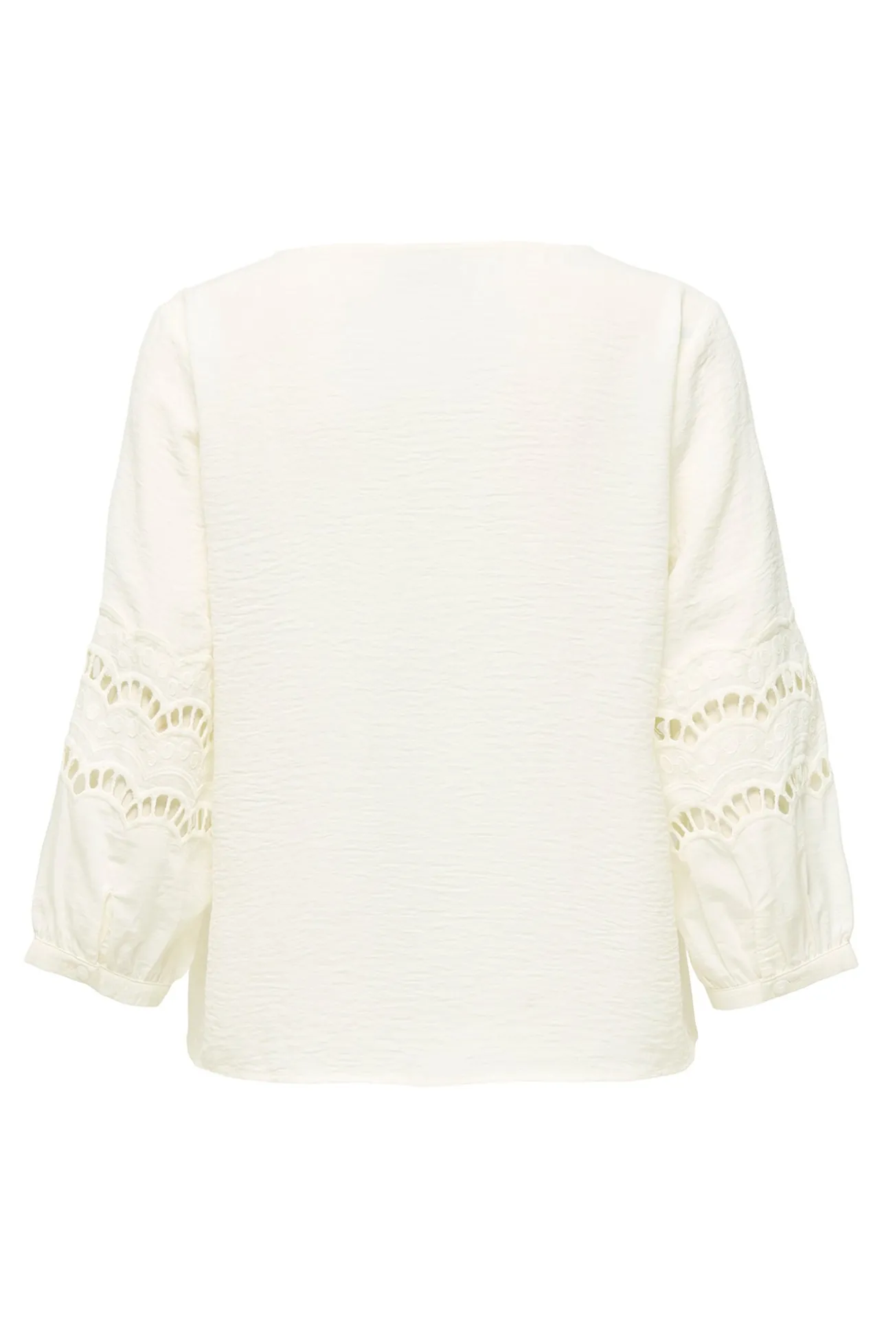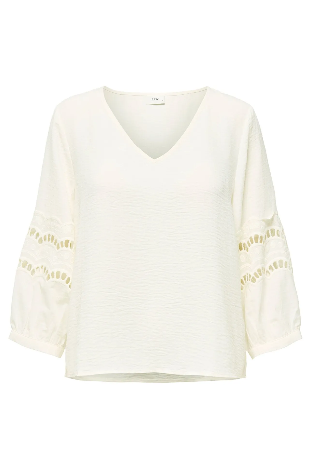 – Corte holgado, cuello pico y manga abullonada con detalle de encaje.