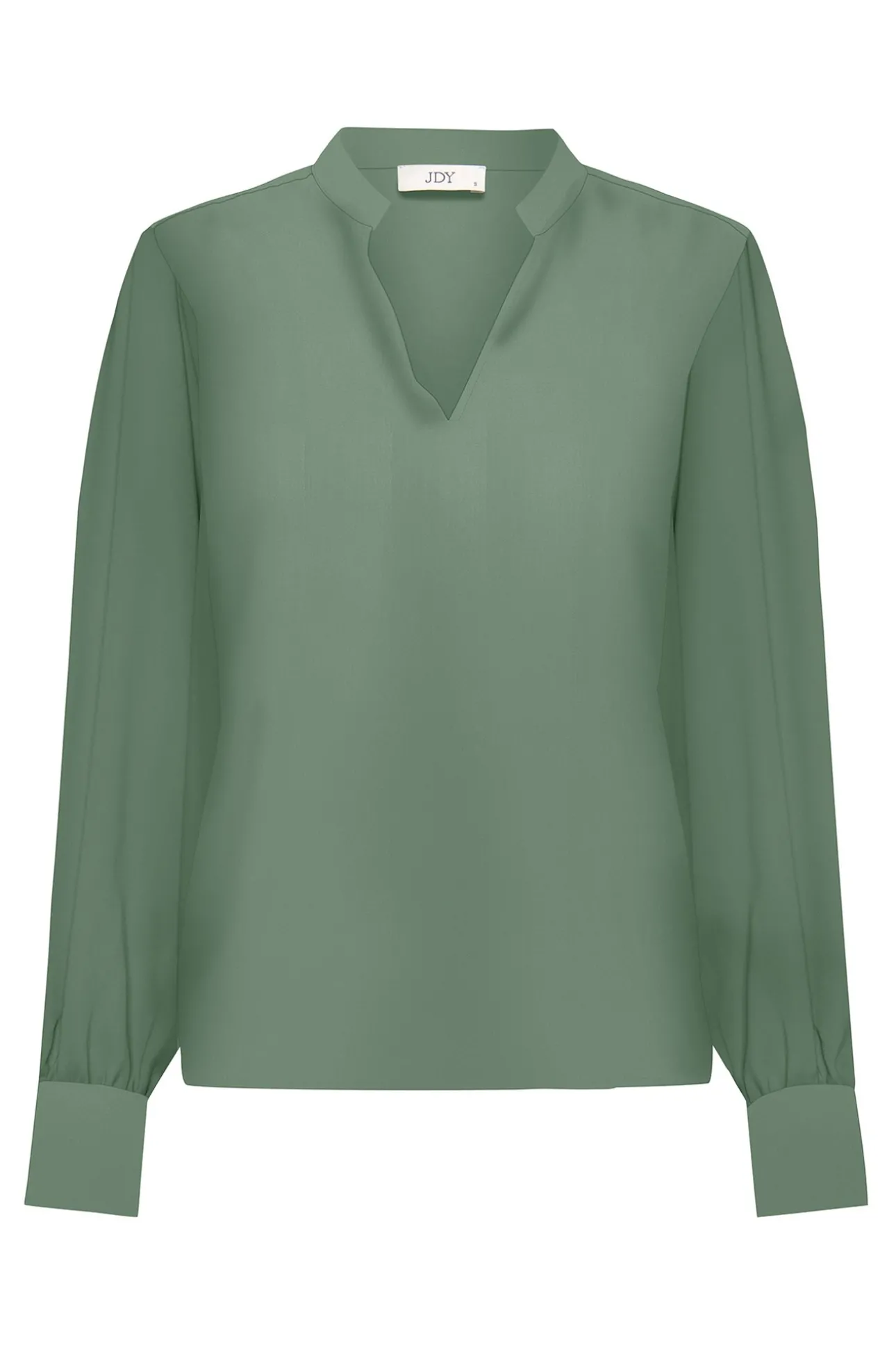 – Corte holgado, cuello mao abierto en pico y manga ligeramente abullonada con puño ajustado.