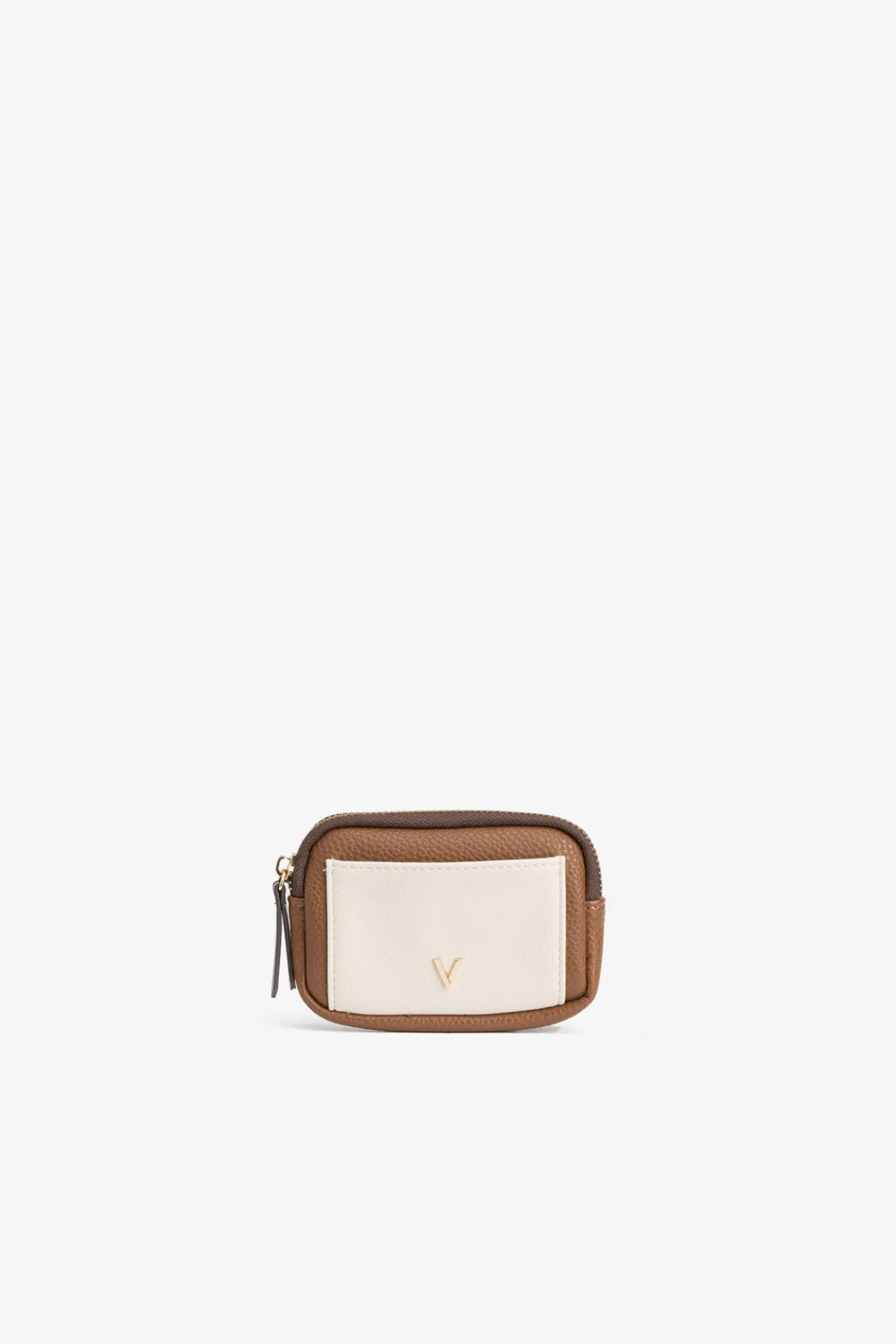 Bolsita efecto piel tricolor con cremallera superior.