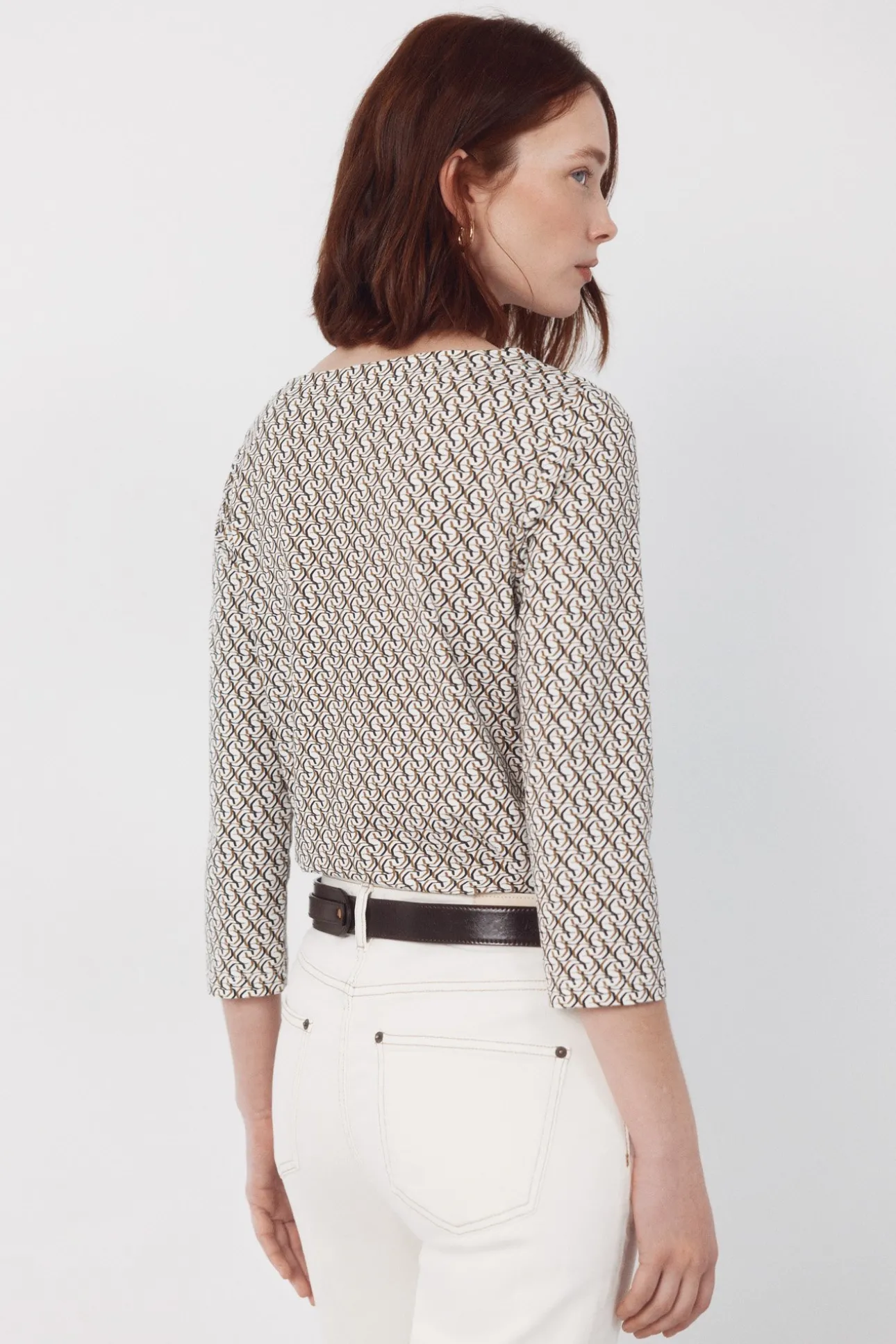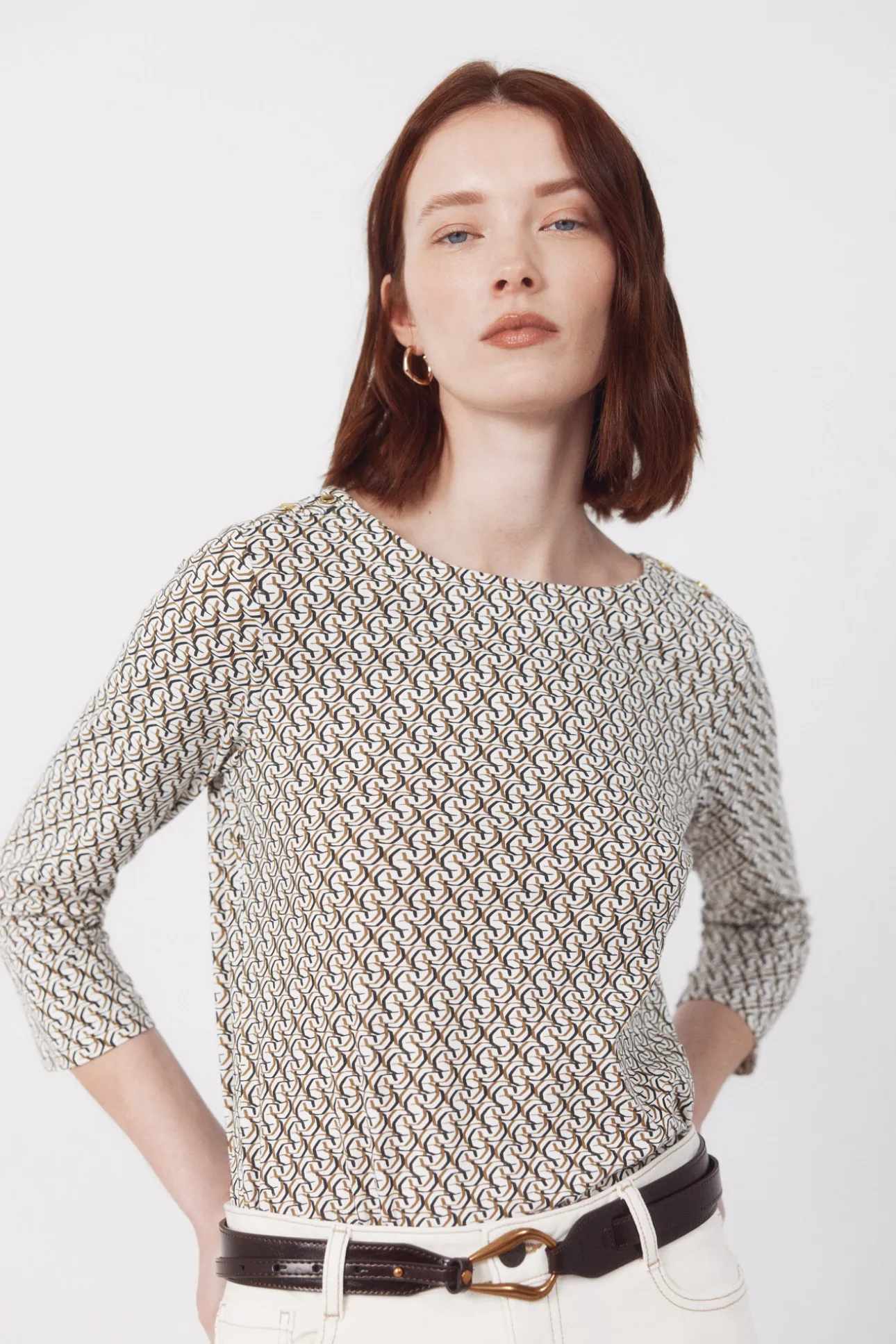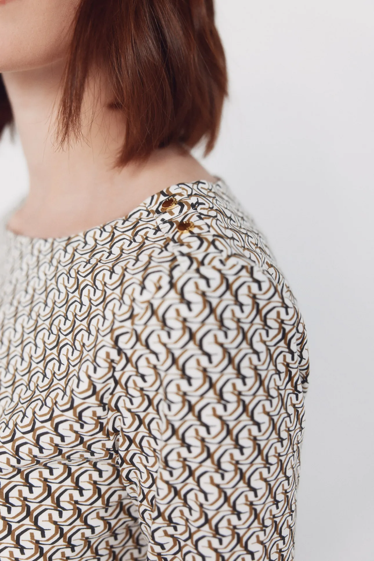 – Escote barco con botones metálicos dorados en manga