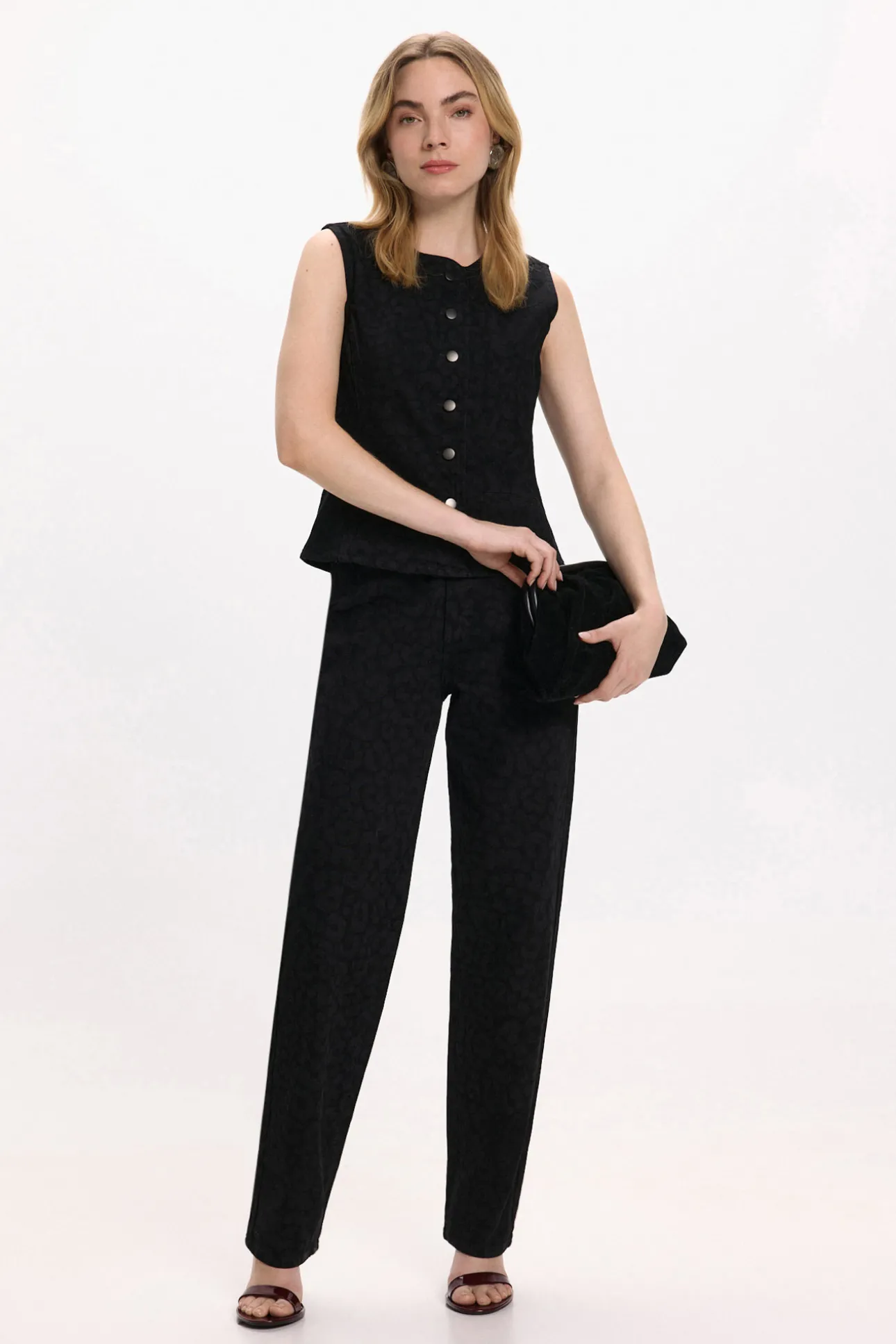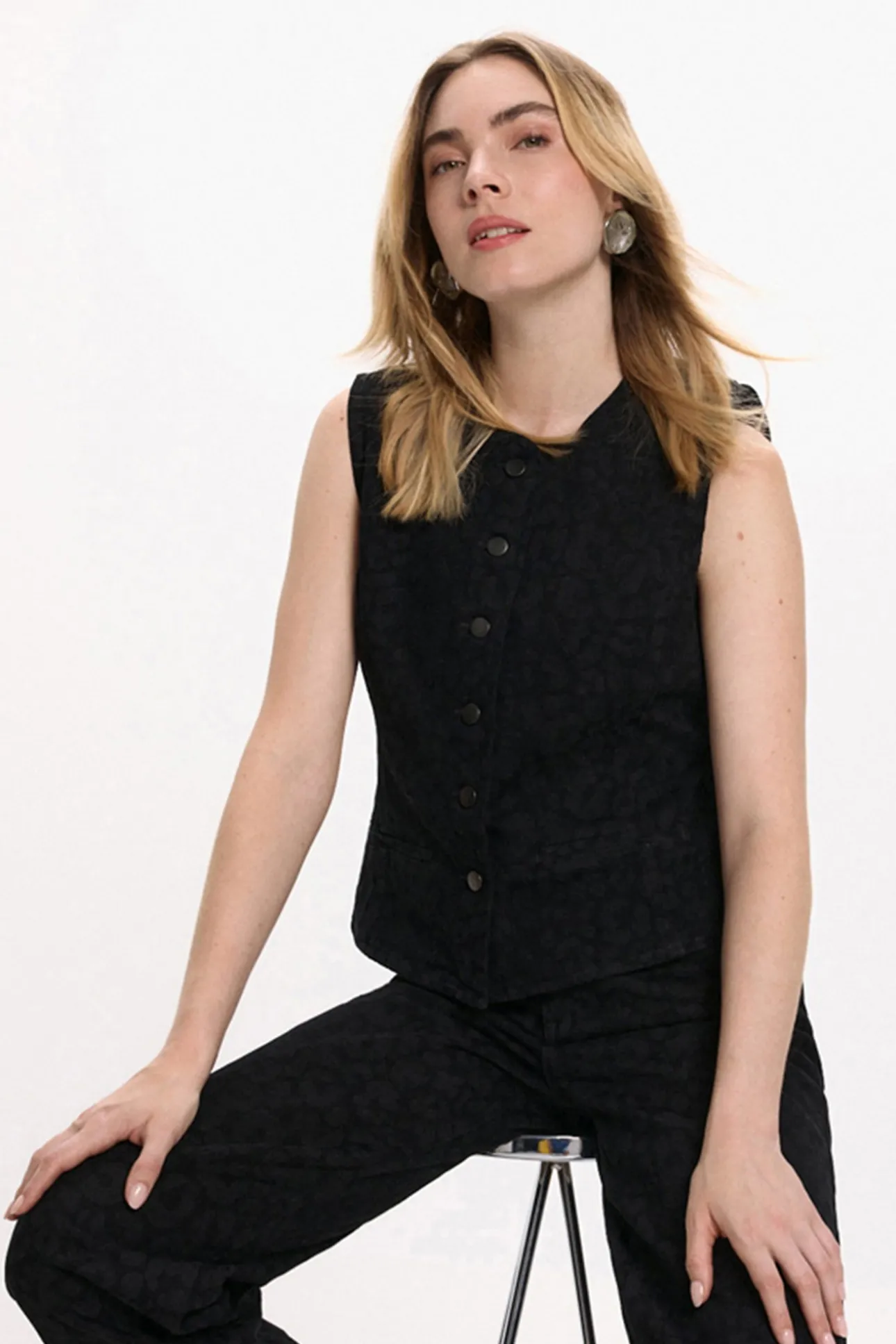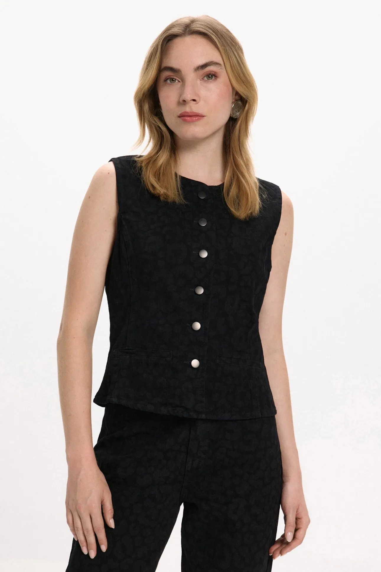 – Cierre frontal con botones metalizados