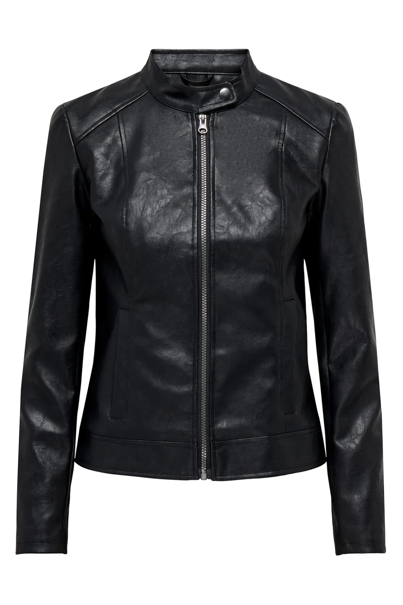 – Corte ajustado, cuello mao con broche metálico, cierre de cremallera frontal y bolsillos laterales.