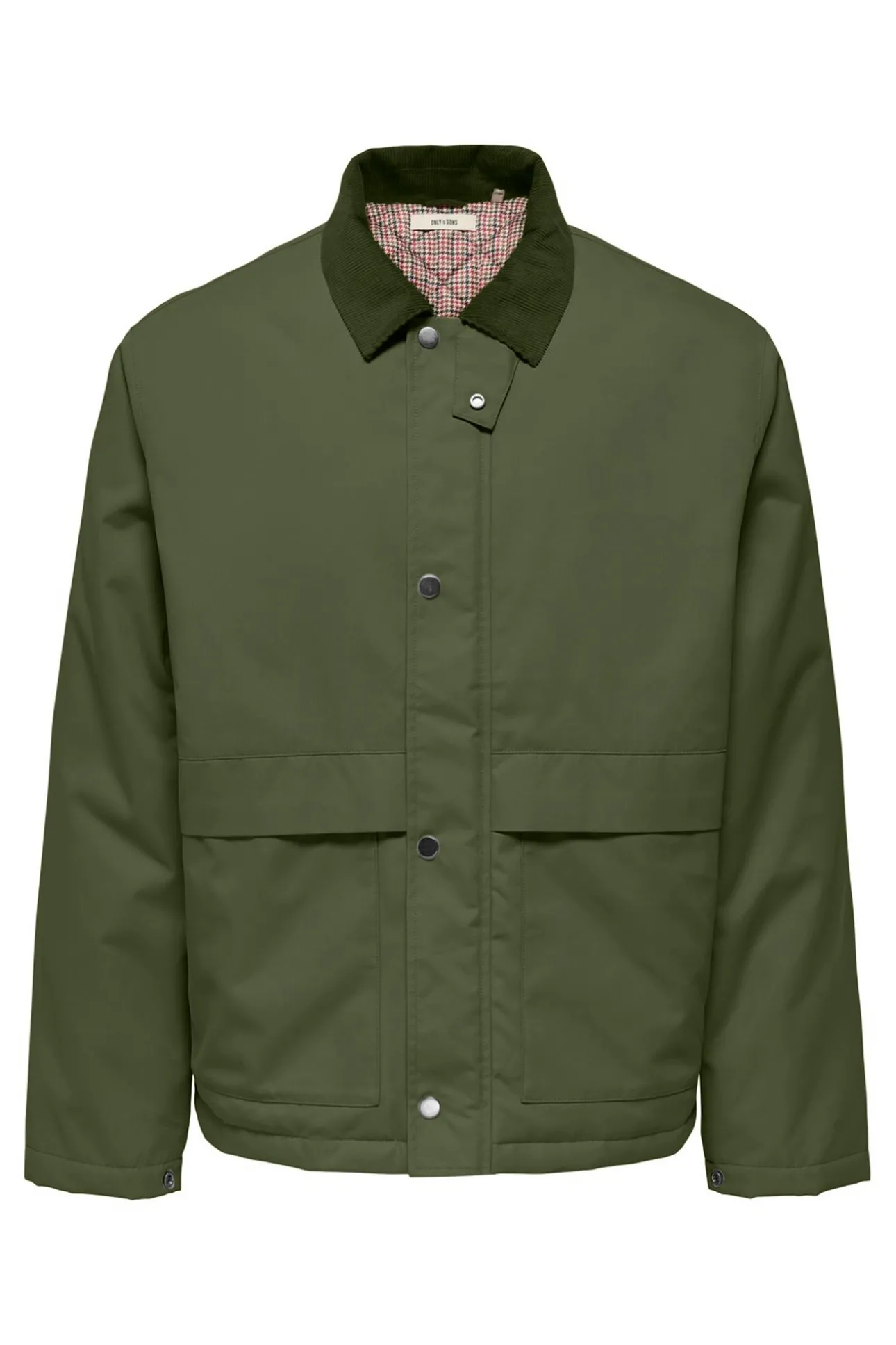 – Corte recto, cuello cásico, cierre de cremallera con solapa con botones a presión, bolsillos frontales con solapa y forro interior visible con estampado de cuadros.
