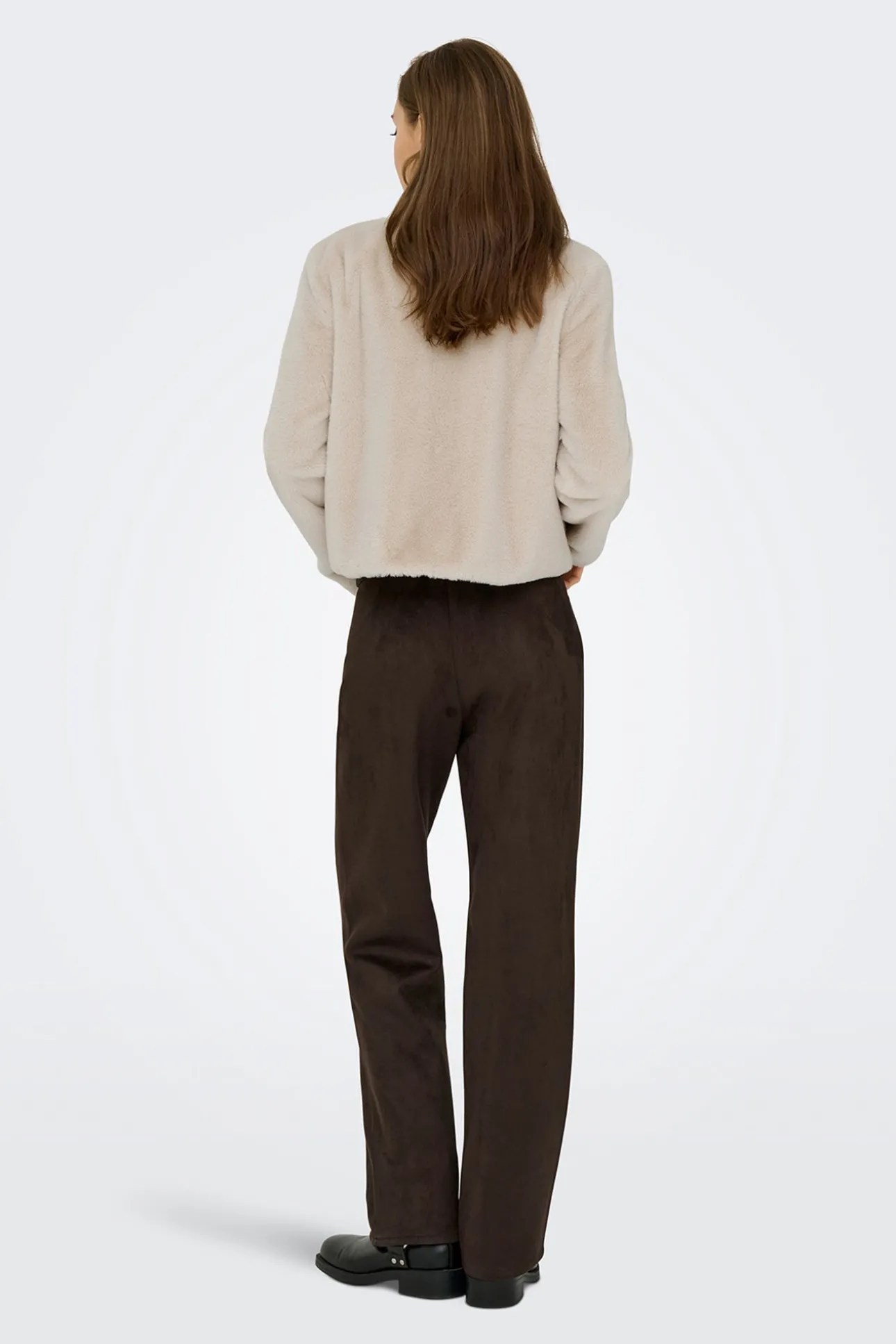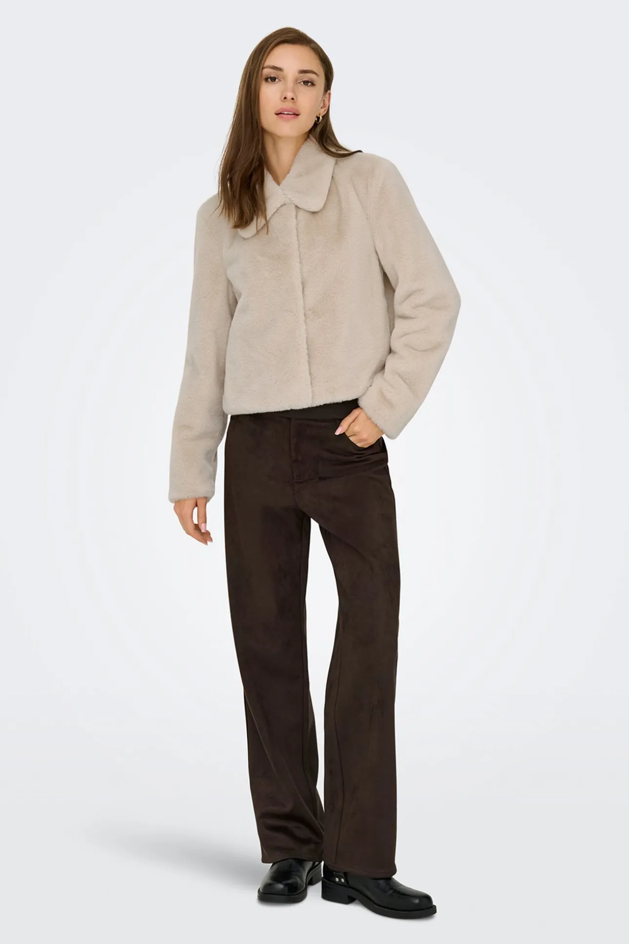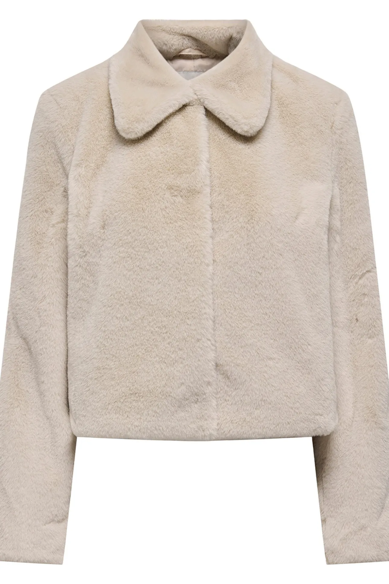 – Corte recto, cuello con solapas, cierre oculto de botones a presión y bolsillos laterales.
