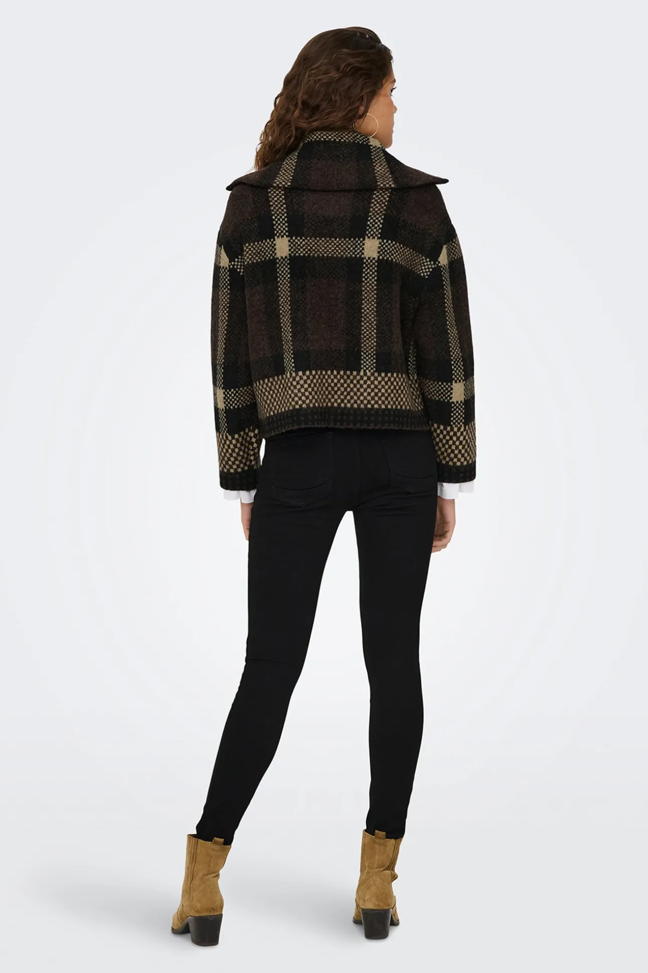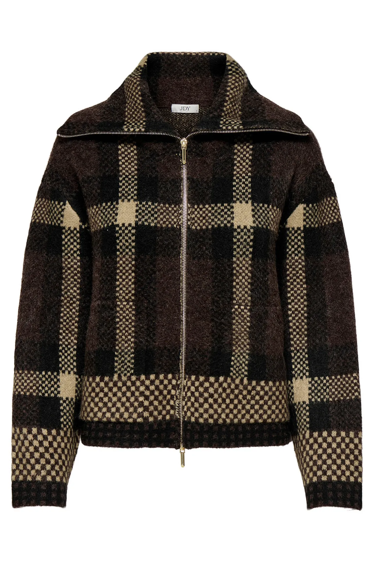 – Corte recto, cuello alto, manga larga, cierre de cremallera metálica frontal en doble dirección, bolsillos frontales y estampado de cuadros.