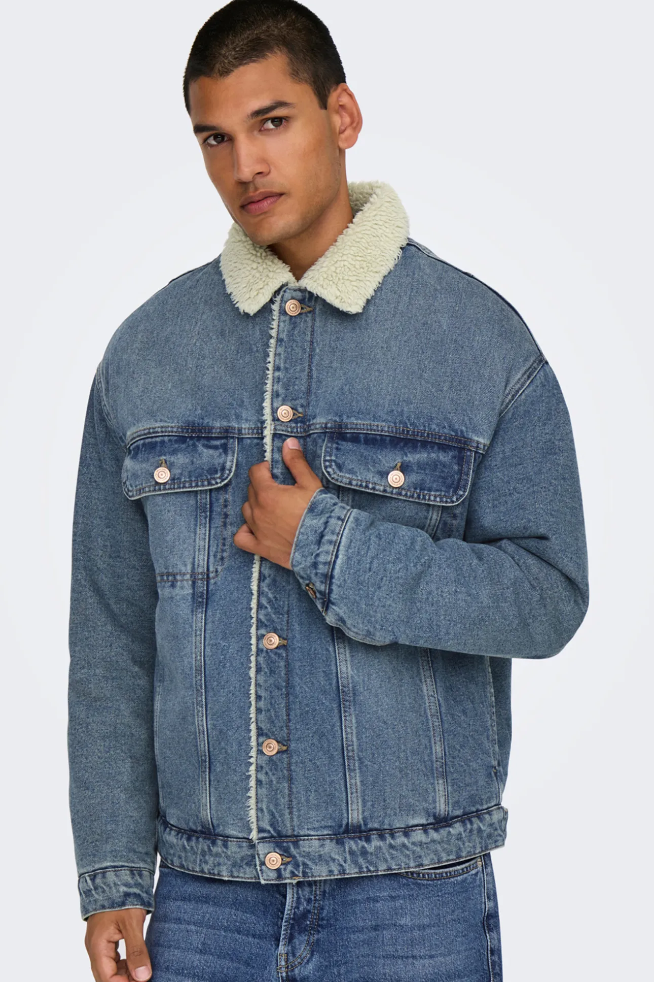 – Corte regular, cuello clásico, cierre de botones delantero y bolsillos frontales superiores.