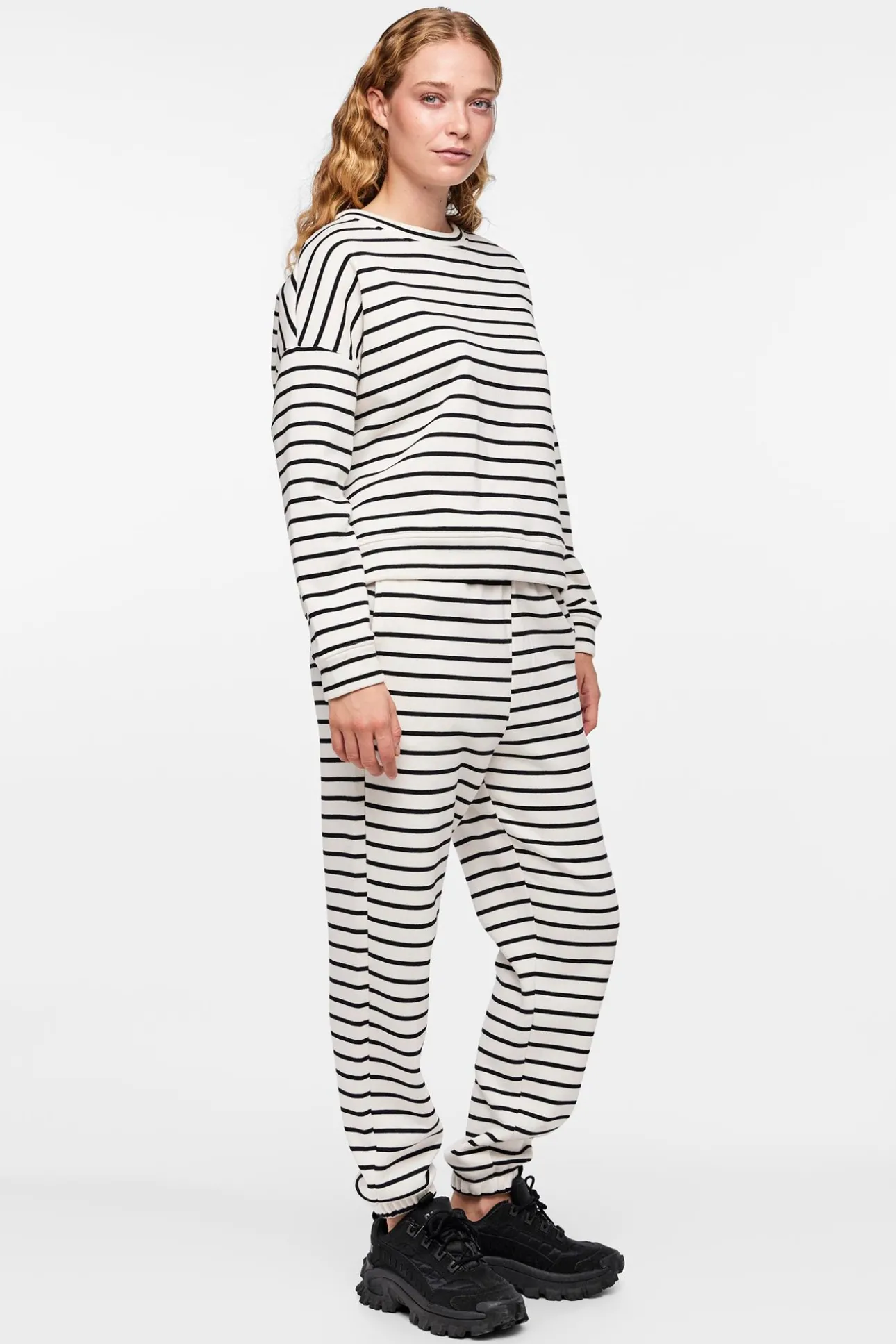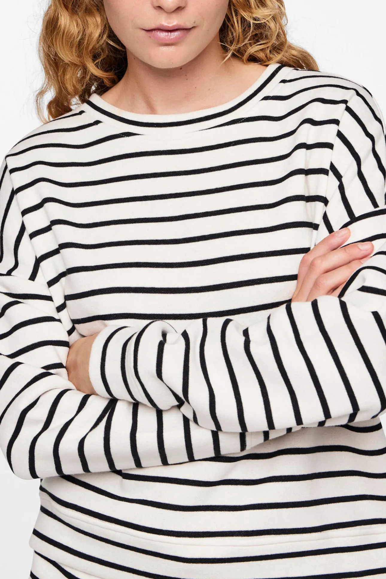 Cotton sweatshirt with striped print. Closed collar and long sleeves. Soft texture.
