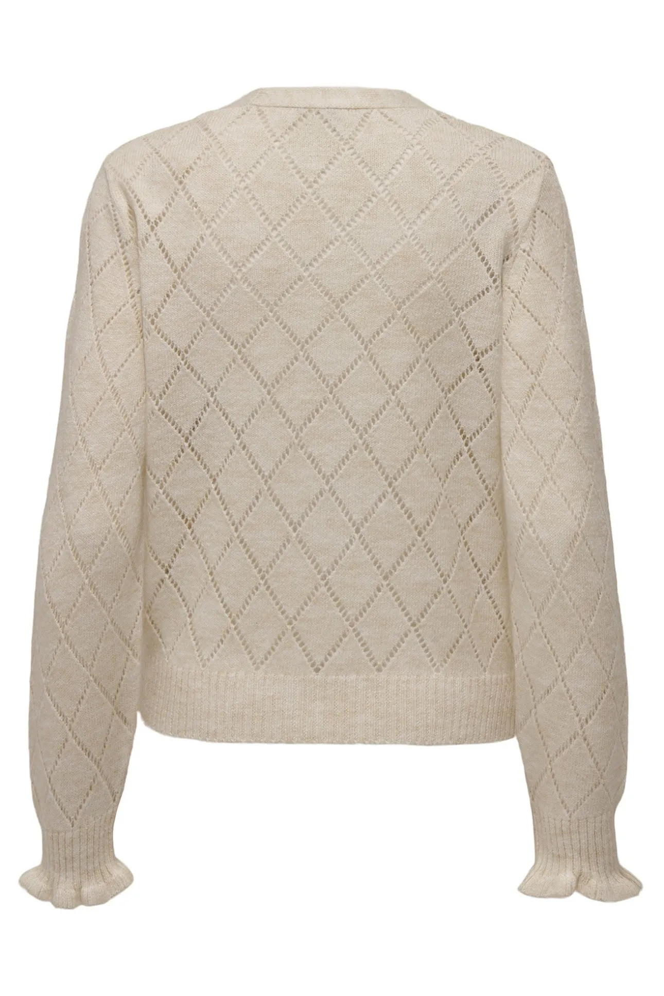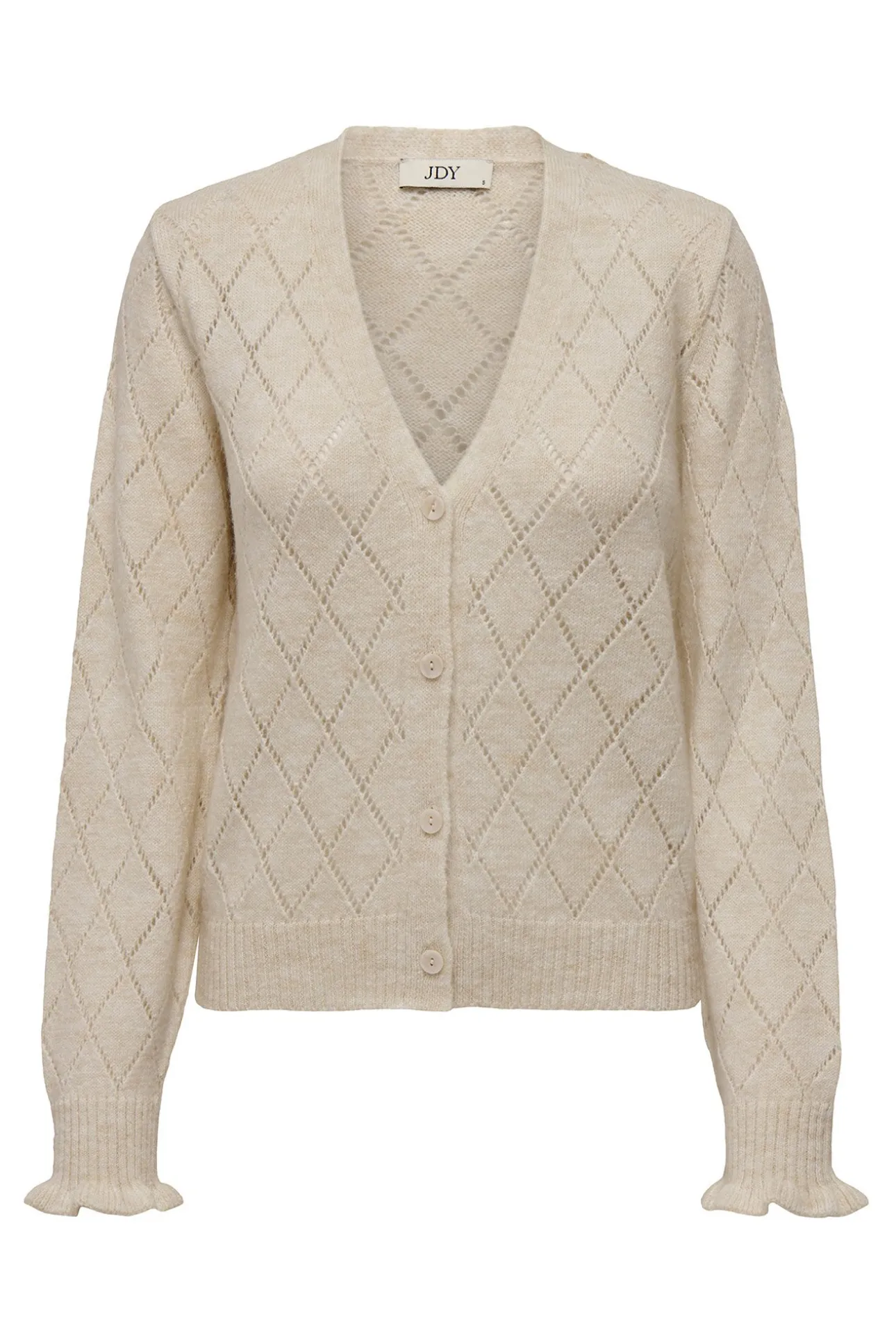 – Corte recto, manga larga, cuello pico, patrón geométrico y detalle de volantes.