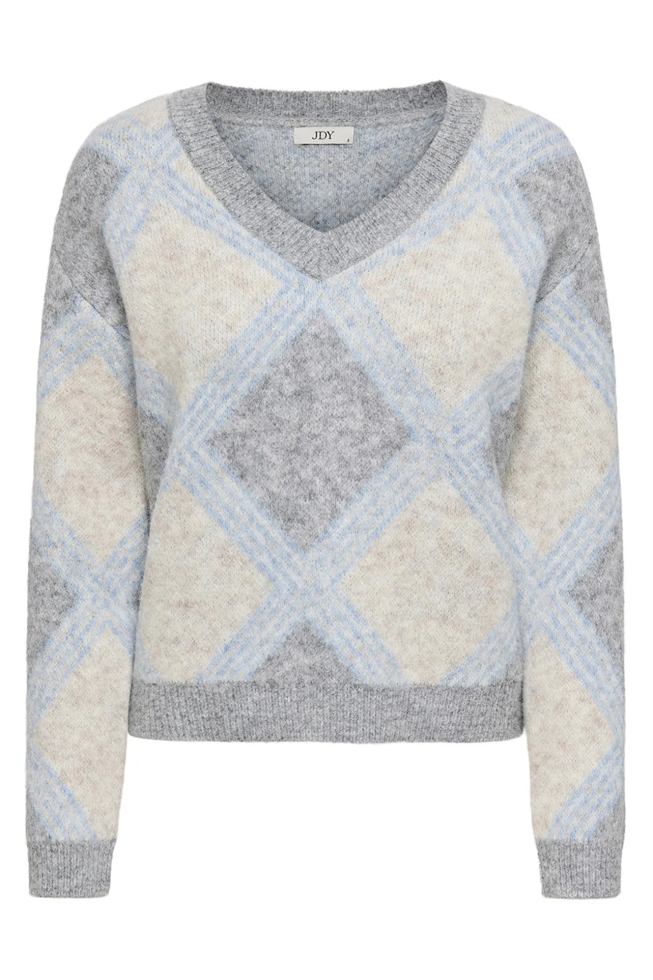 – Corte recto, manga larga, bordes acanalados y estampado geométrico.