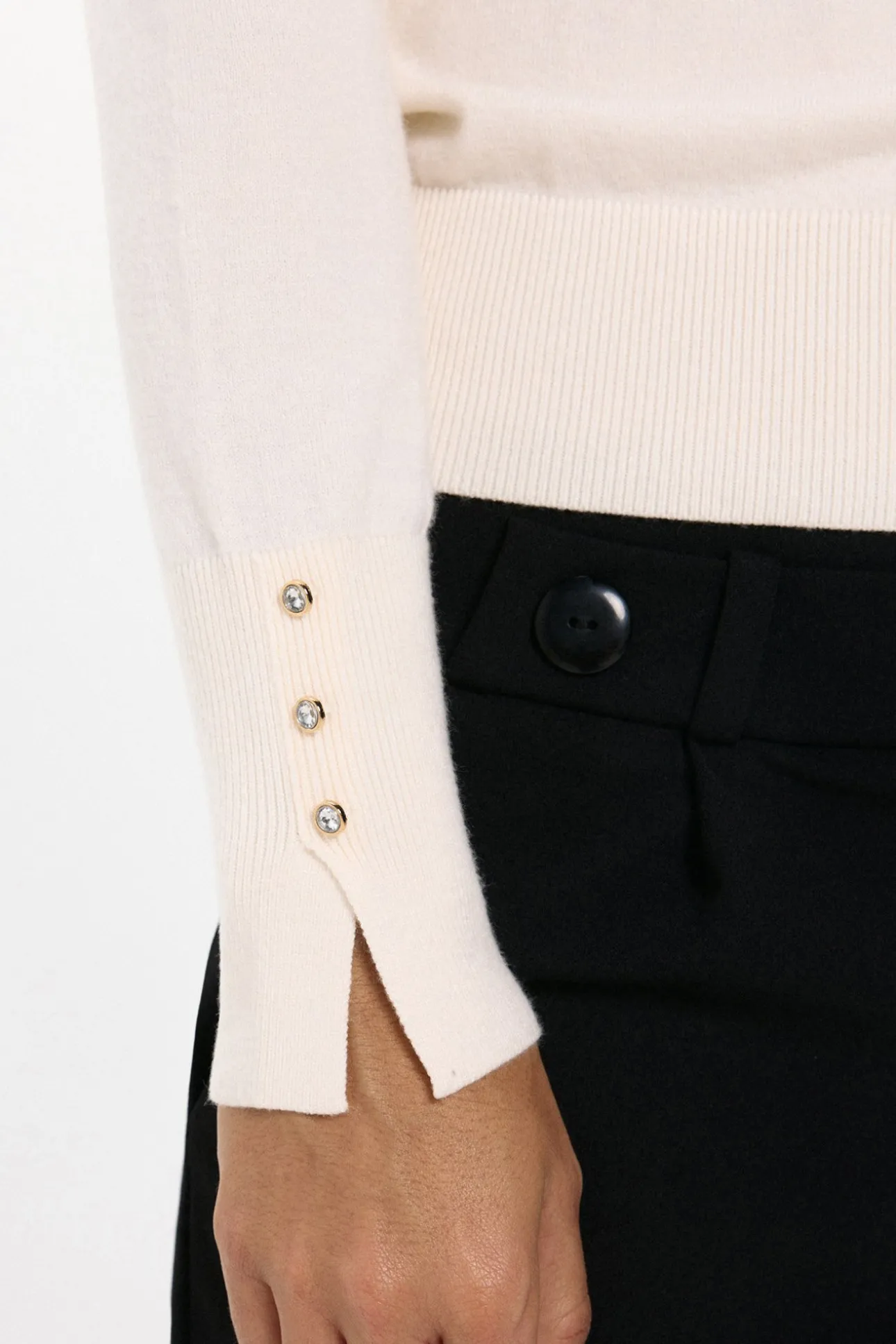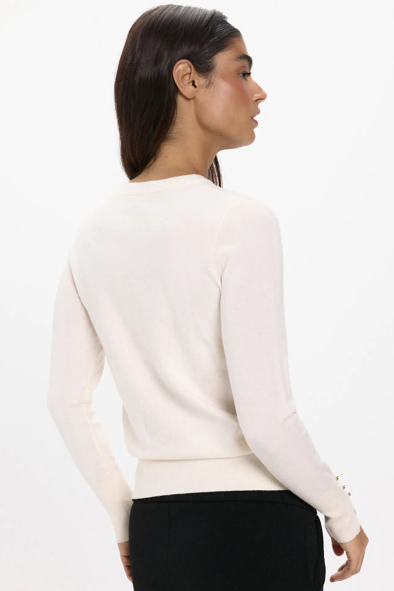 – Corte recto, manga larga con detalle de botones en los puños.