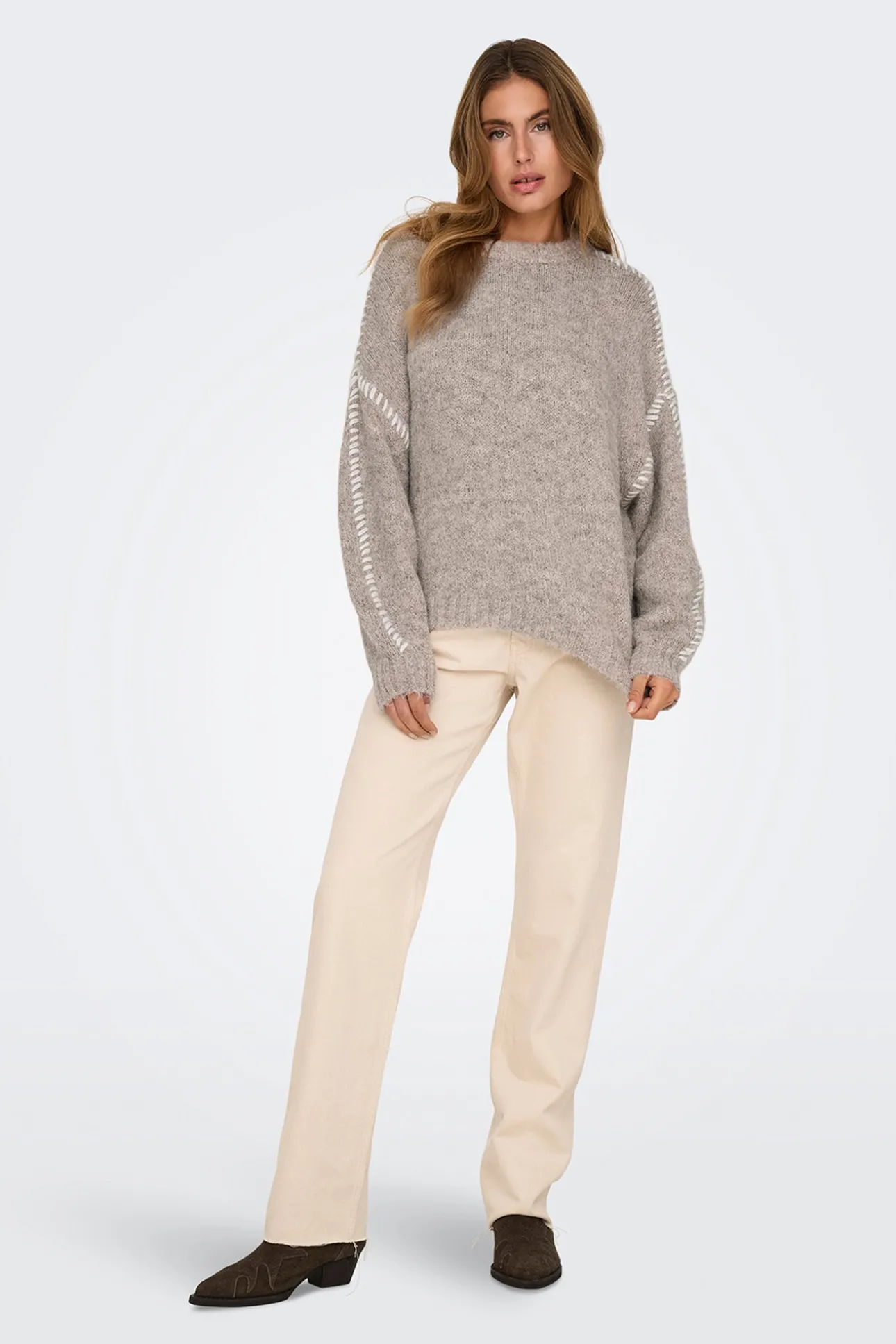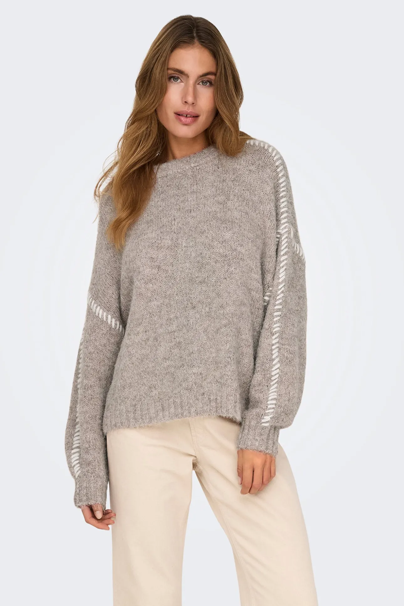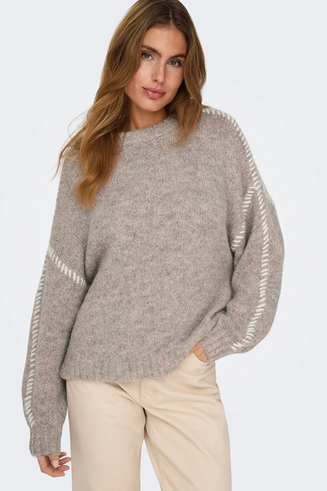 – Corte holgado, manga larga abullonada y costuras decorativas a contraste.