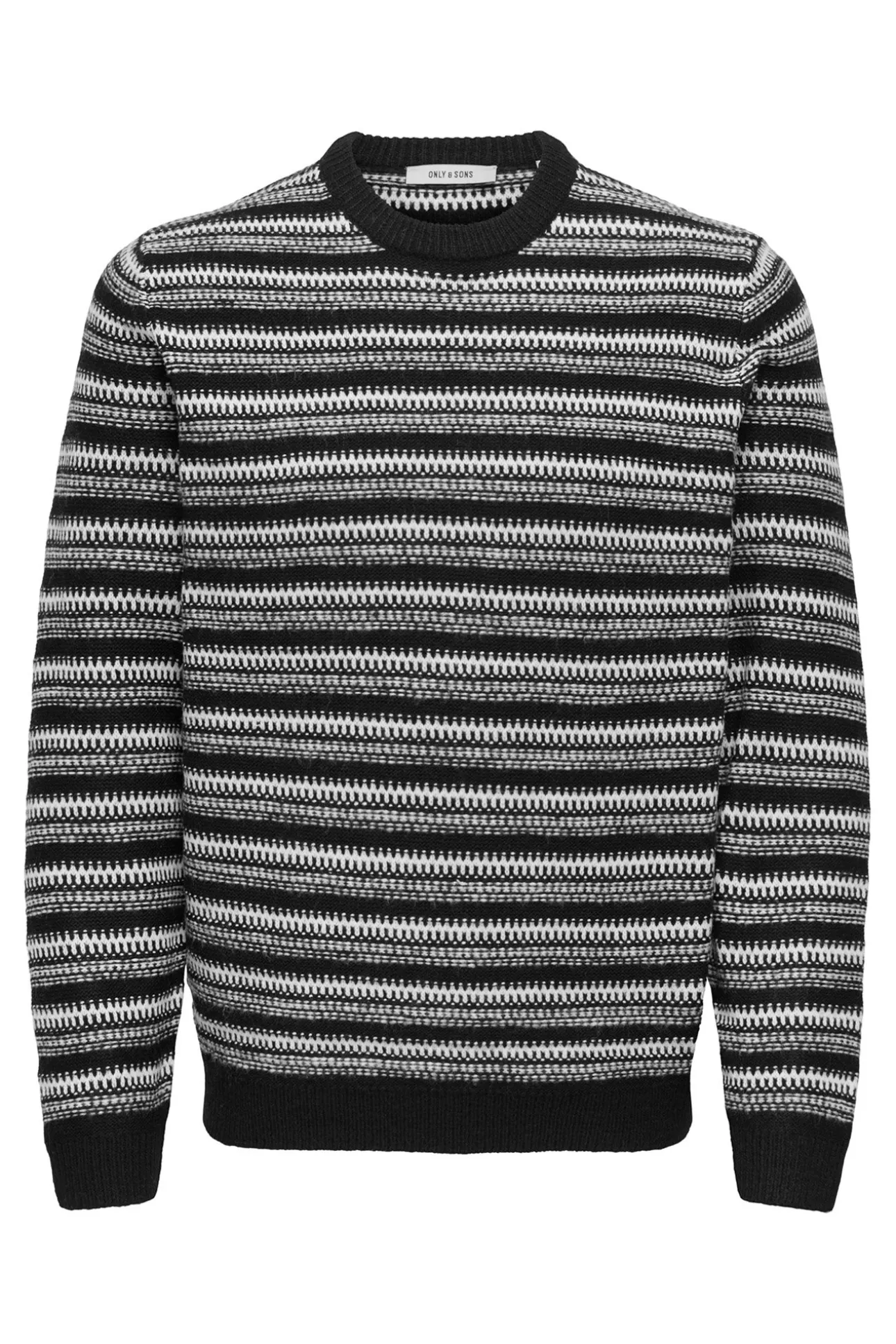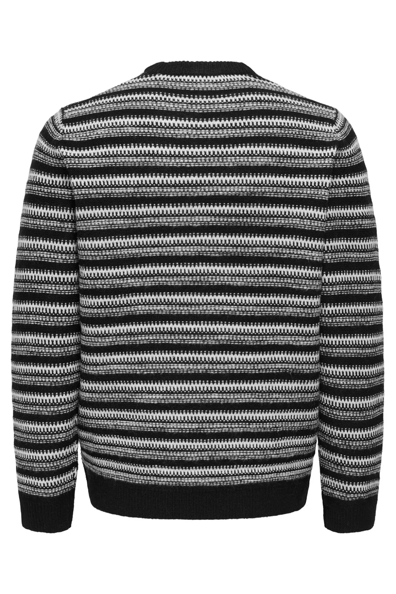 – Corte regular, manga larga y patrón en zigzag con textura y rayas horizontales.