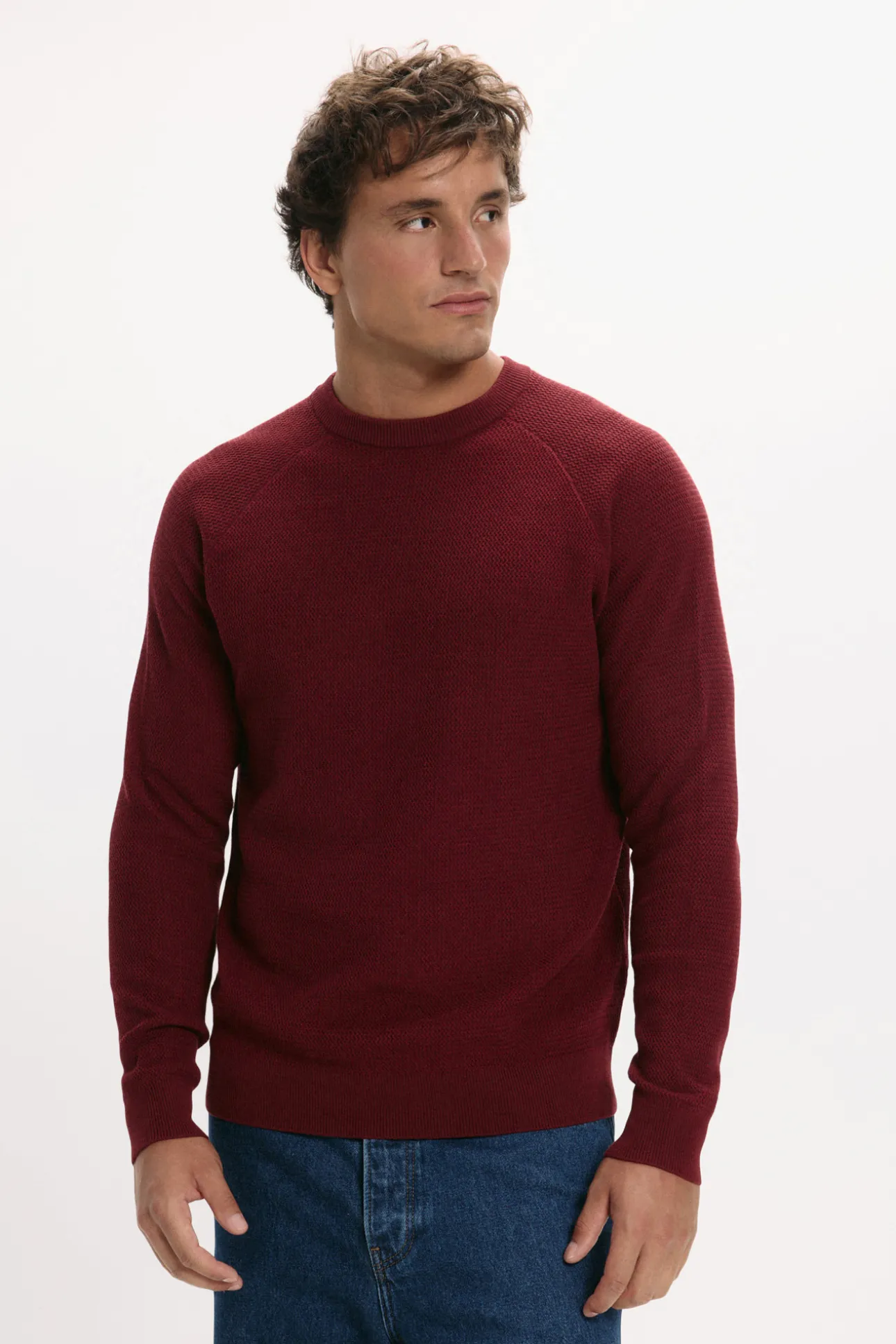 – Corte regular, patrón trenzado y manga larga.