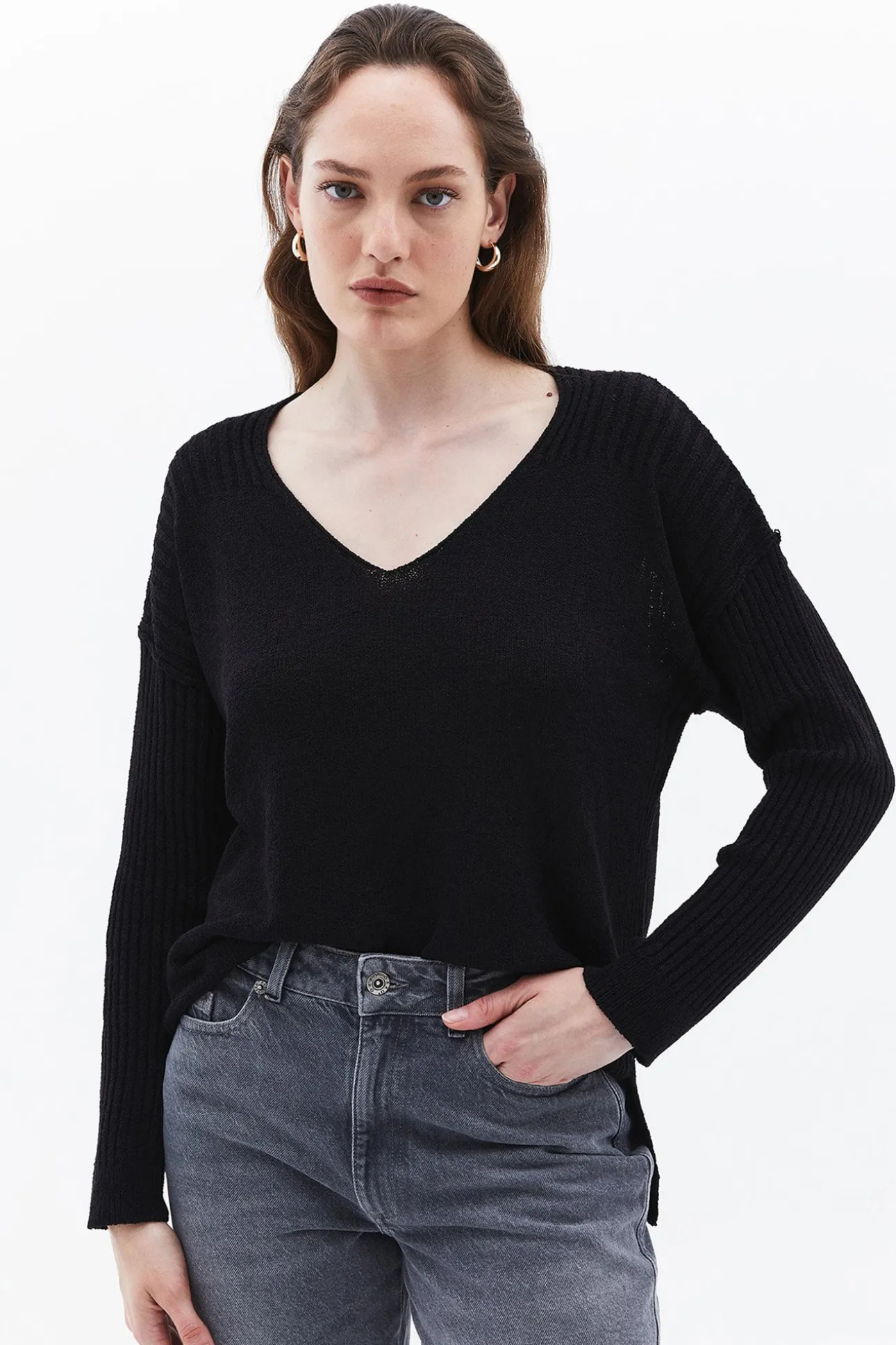 Jersey de punto con cuello de pico para mujer.