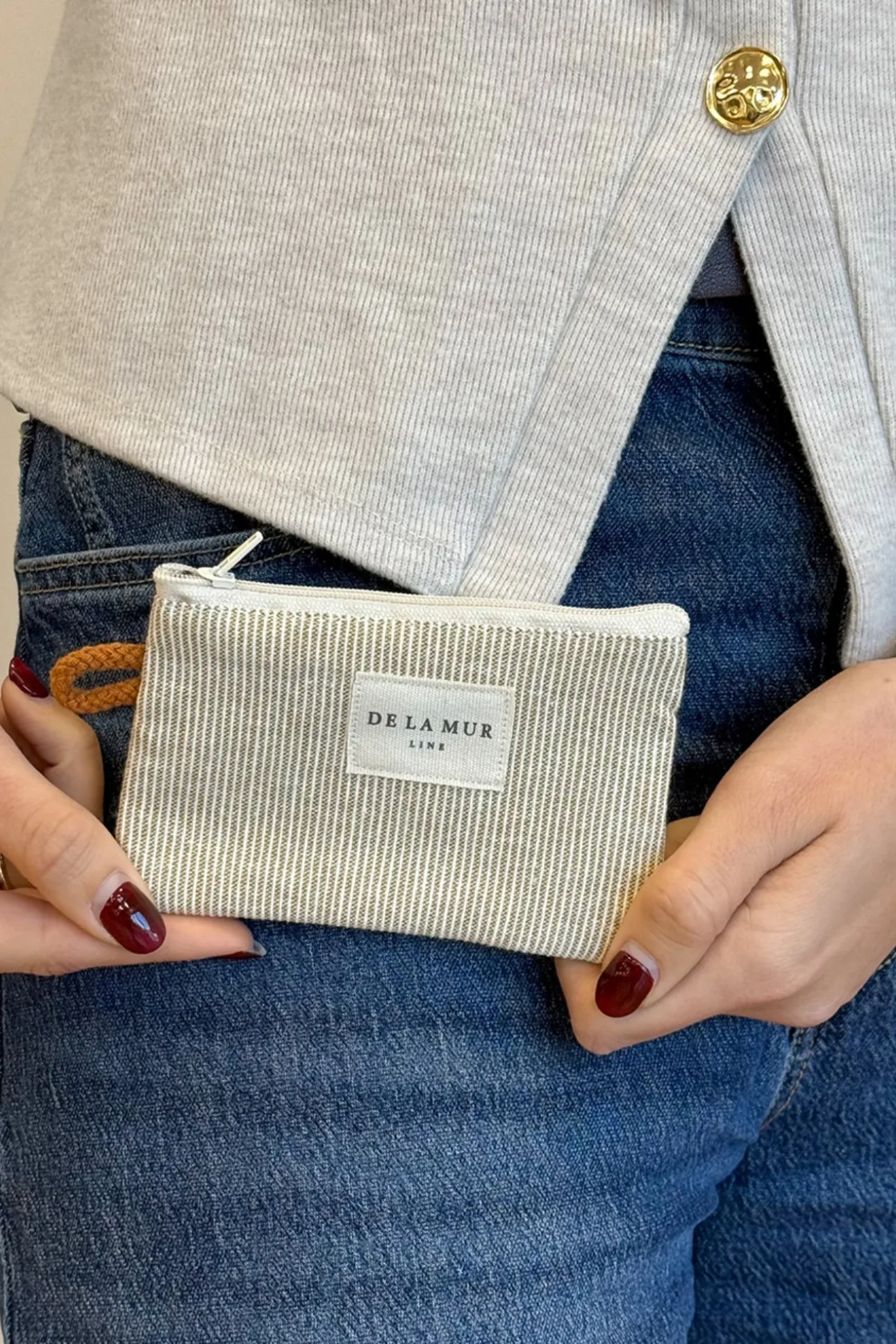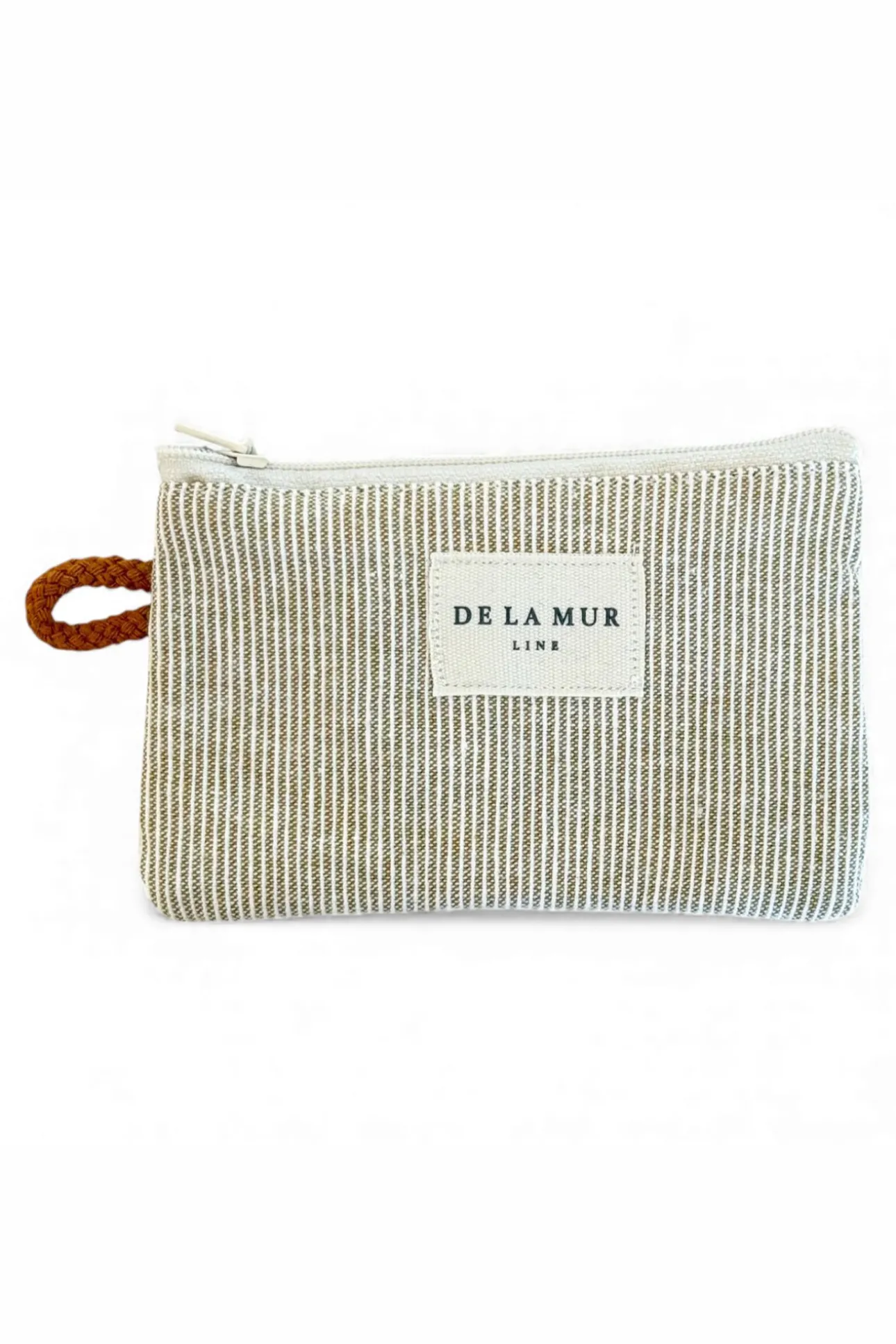 Monedero con cremallera en la parte superior y pequeña asa de cordón de color teja en el lateral. Con tejido fino con relieve 80% algodón y 20% poliéster con estampado a rayas en tono mostaza clarito. Cada articulo puede tener una variación en el estampado, dependiendo de donde se haya efectuado el corte de la pieza. Forrado de tejido grueso de color gris en la parte interior. Para su correcto mantenimiento se aconseja lavarlo en frío y no utilizar secadora.
