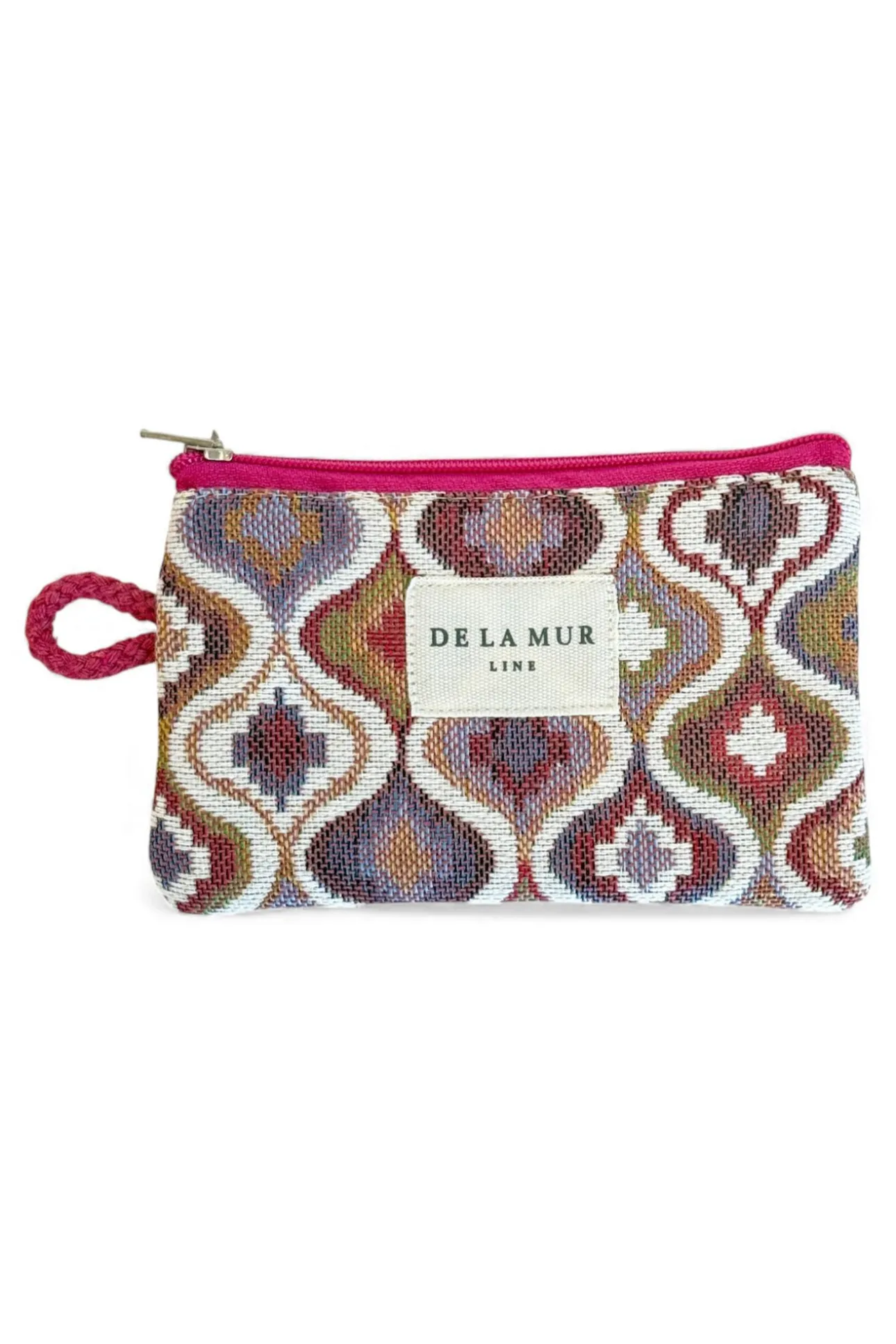 Monedero con cremallera en la parte superior y pequeña asa de cordón de color rosa en el lateral. Con tejido grueso de jacquard 80% algodón y 20% poliéster con estampado geométrico en tonos rosados y lilas. Cada articulo puede tener una variación en el estampado, dependiendo de donde se haya efectuado el corte de la pieza. Forrado de tejido grueso de color gris en la parte interior. Para su correcto mantenimiento se aconseja lavarlo en frío y no utilizar secadora.