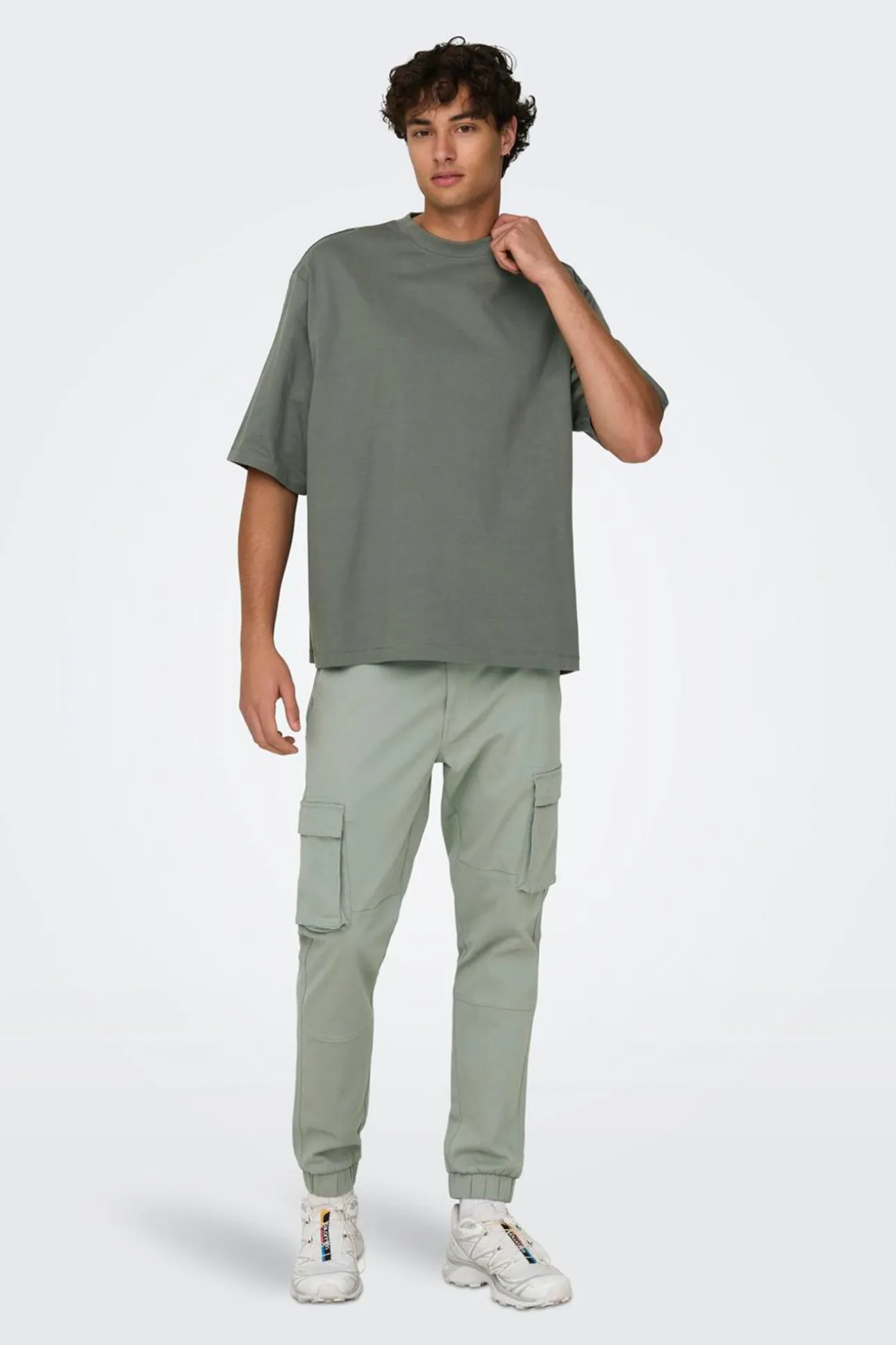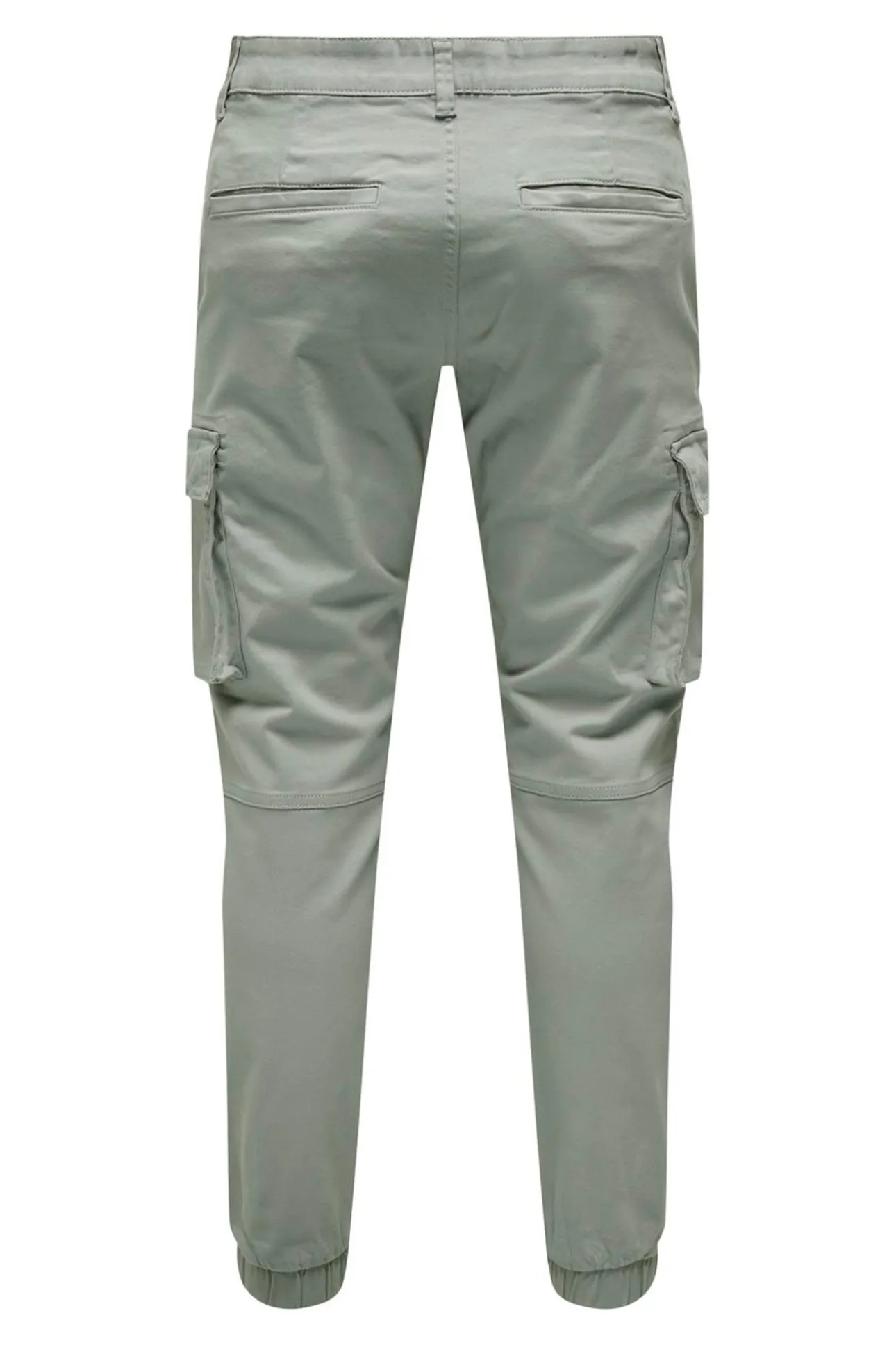 – Corte ajustado, cierre de botón y cremallera, trabillas para cinturón, bolsillos laterales y patente elástica en el bajo.