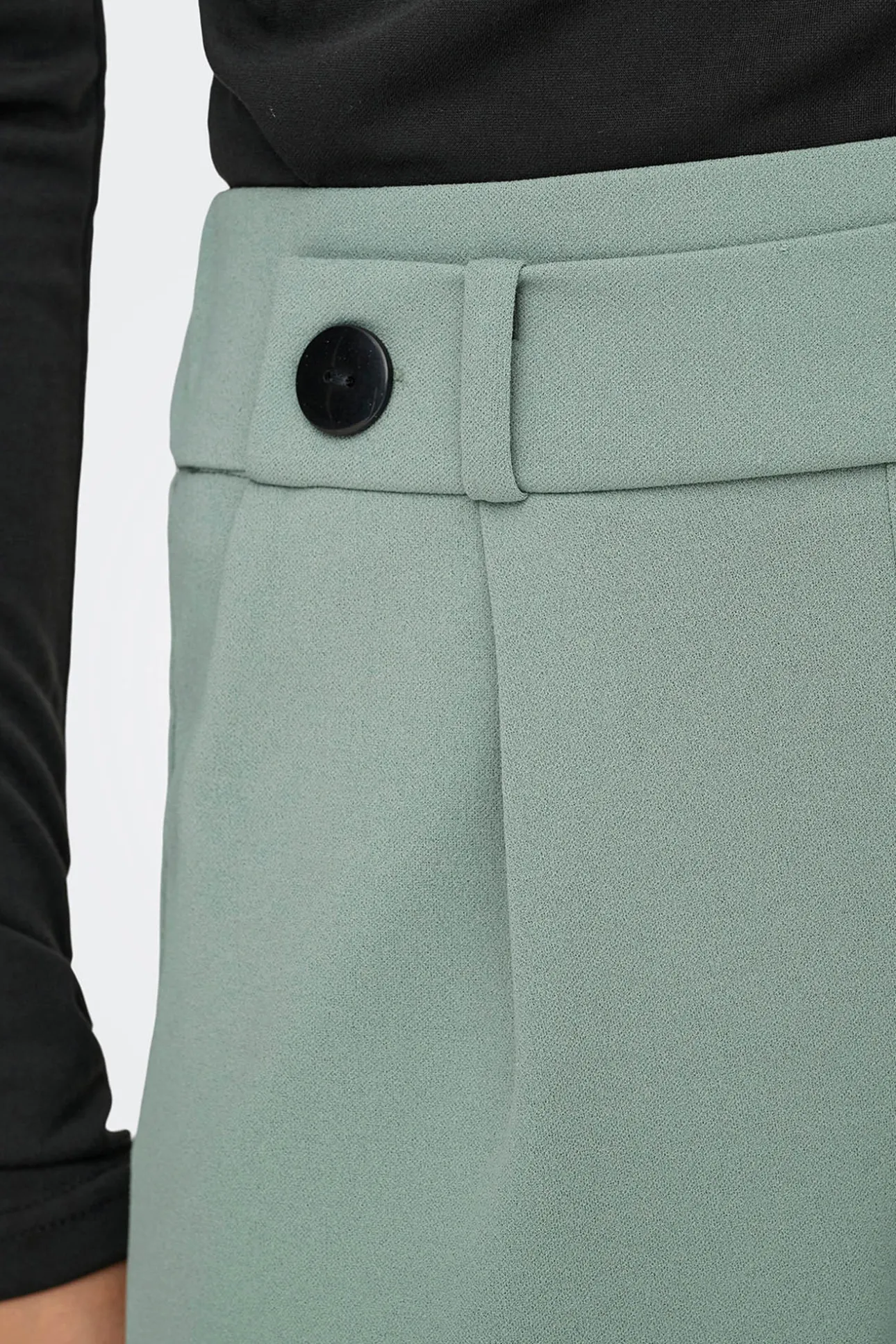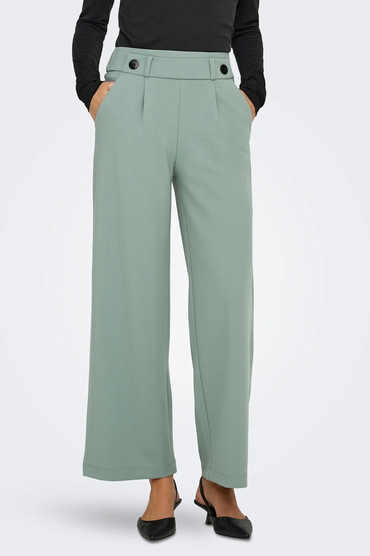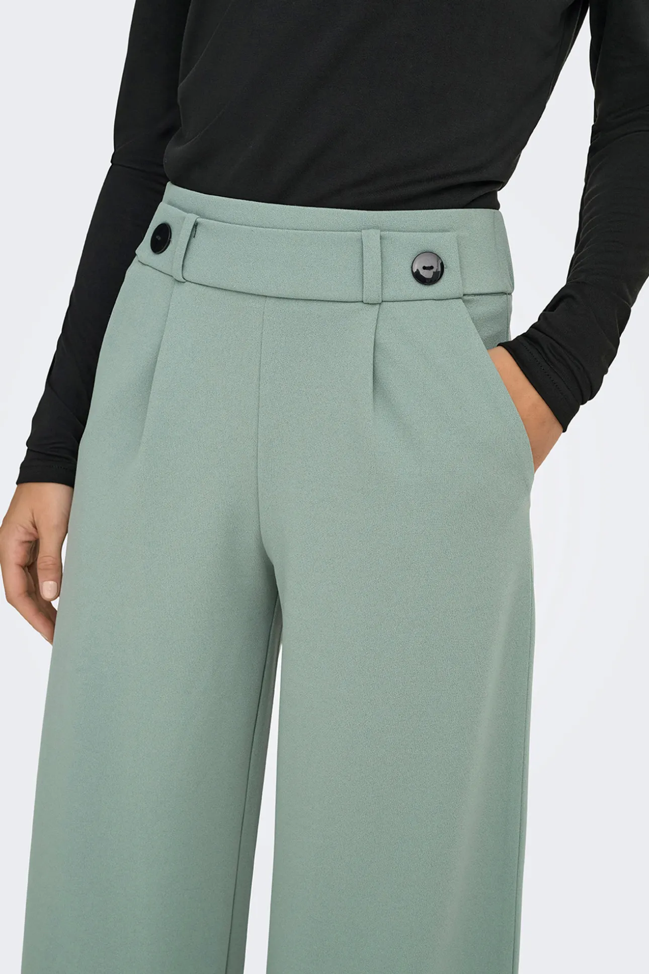 – Tiro alto, cintura elástica con botones decorativos, bolsillos laterales y pinzas frontales.
