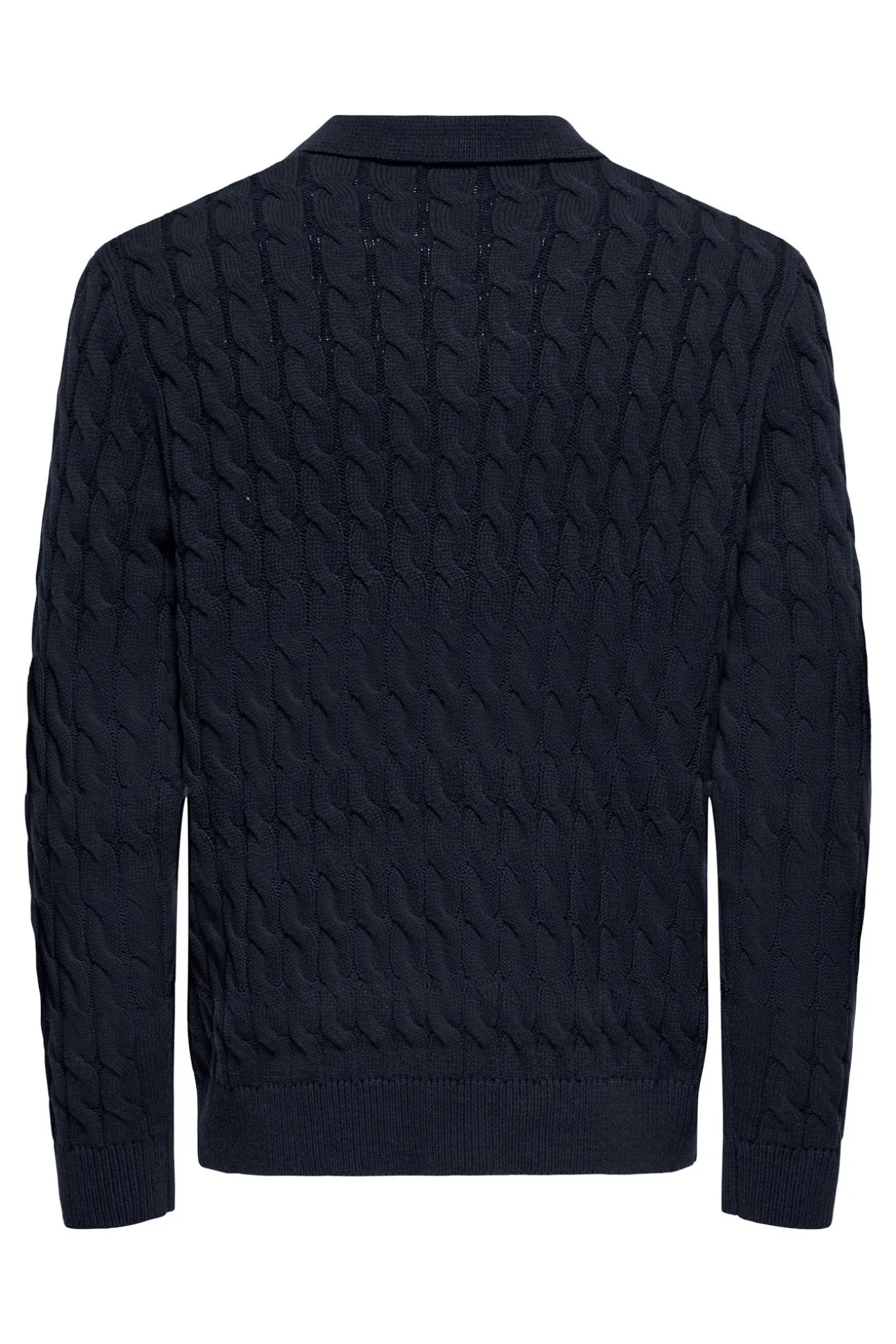 – Corte holgado, cuello polo con cierre de botones y patrón trenzado.