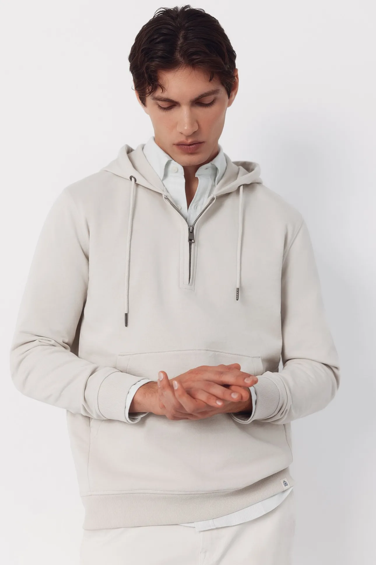 -Cuello con cremallera y capucha, bolsillo canguro.