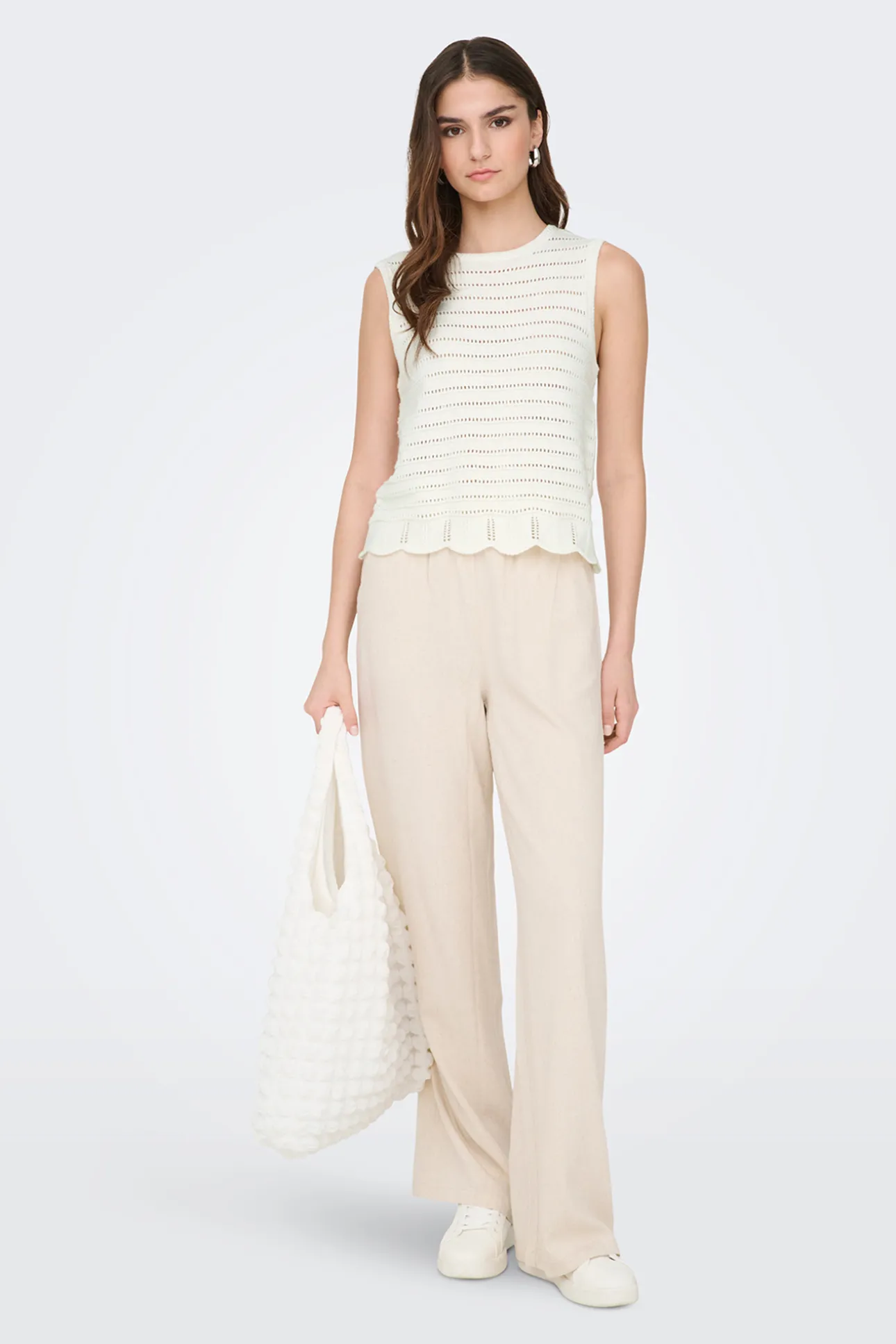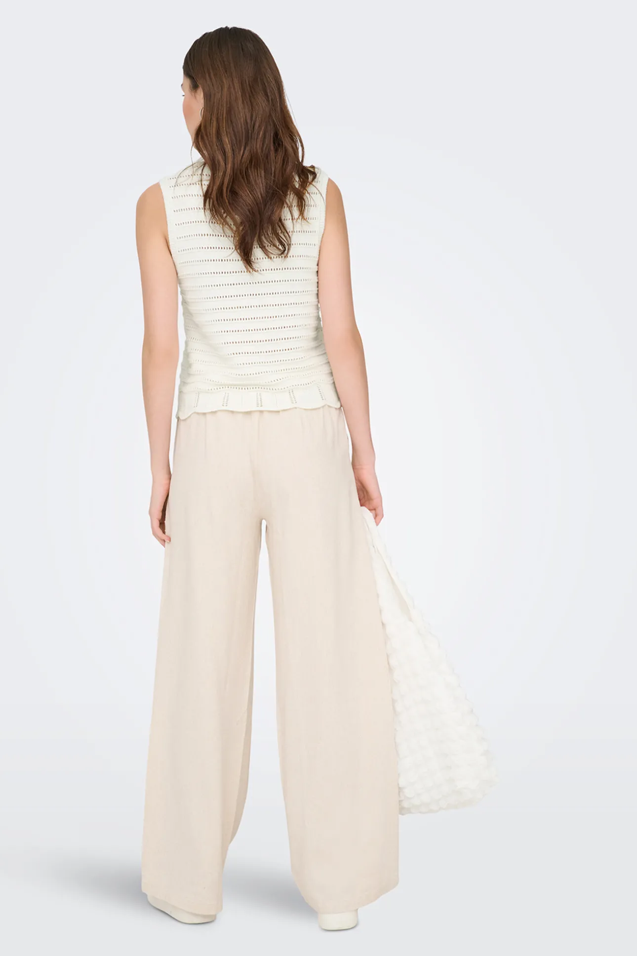 – Corte recto, cuello redondo, detalle de punto abierto y bajo ondulado.