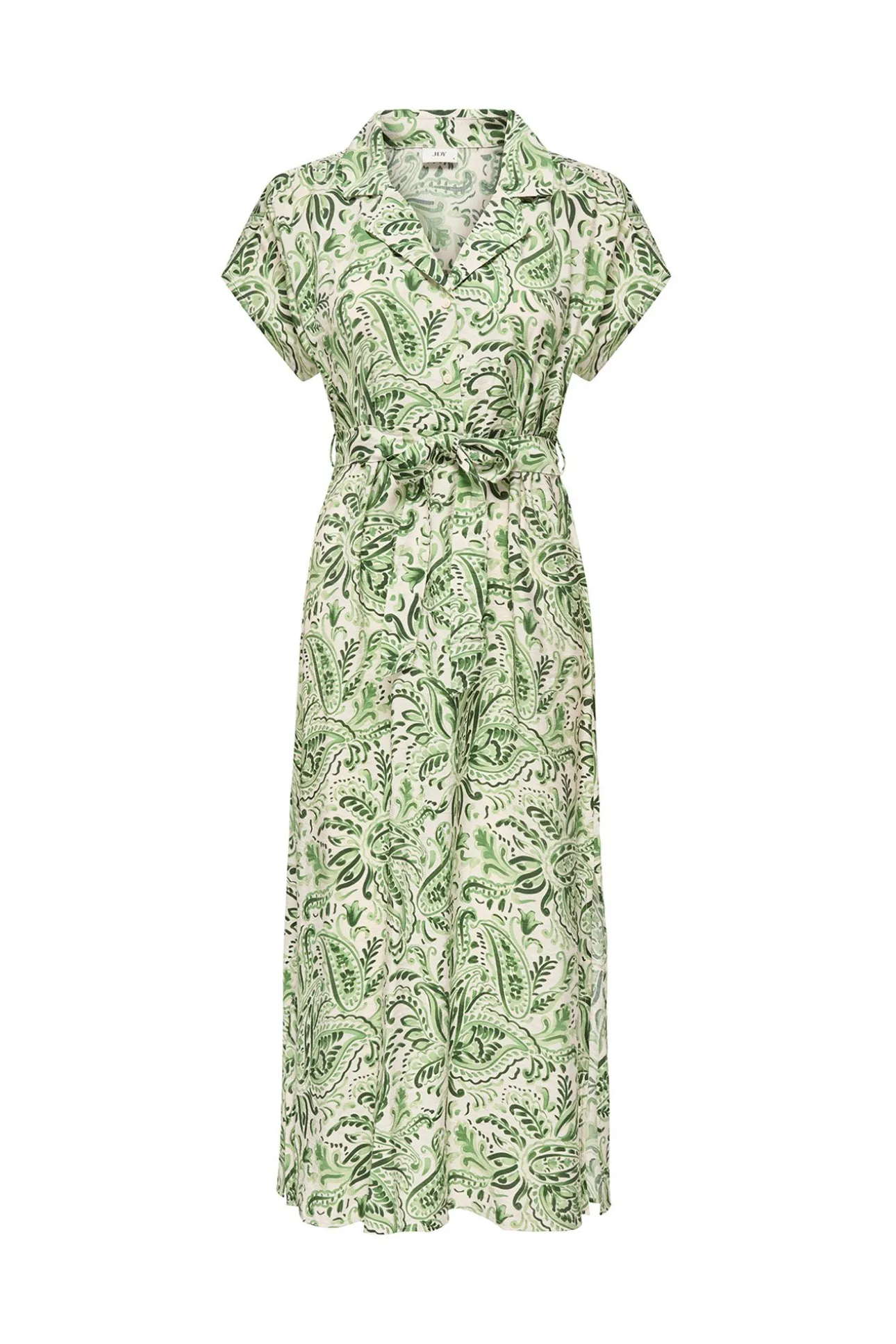 – Corte fluido, cuello camisero con escote en pico cruzado, manga corta y lazo ajustable en la cintura.