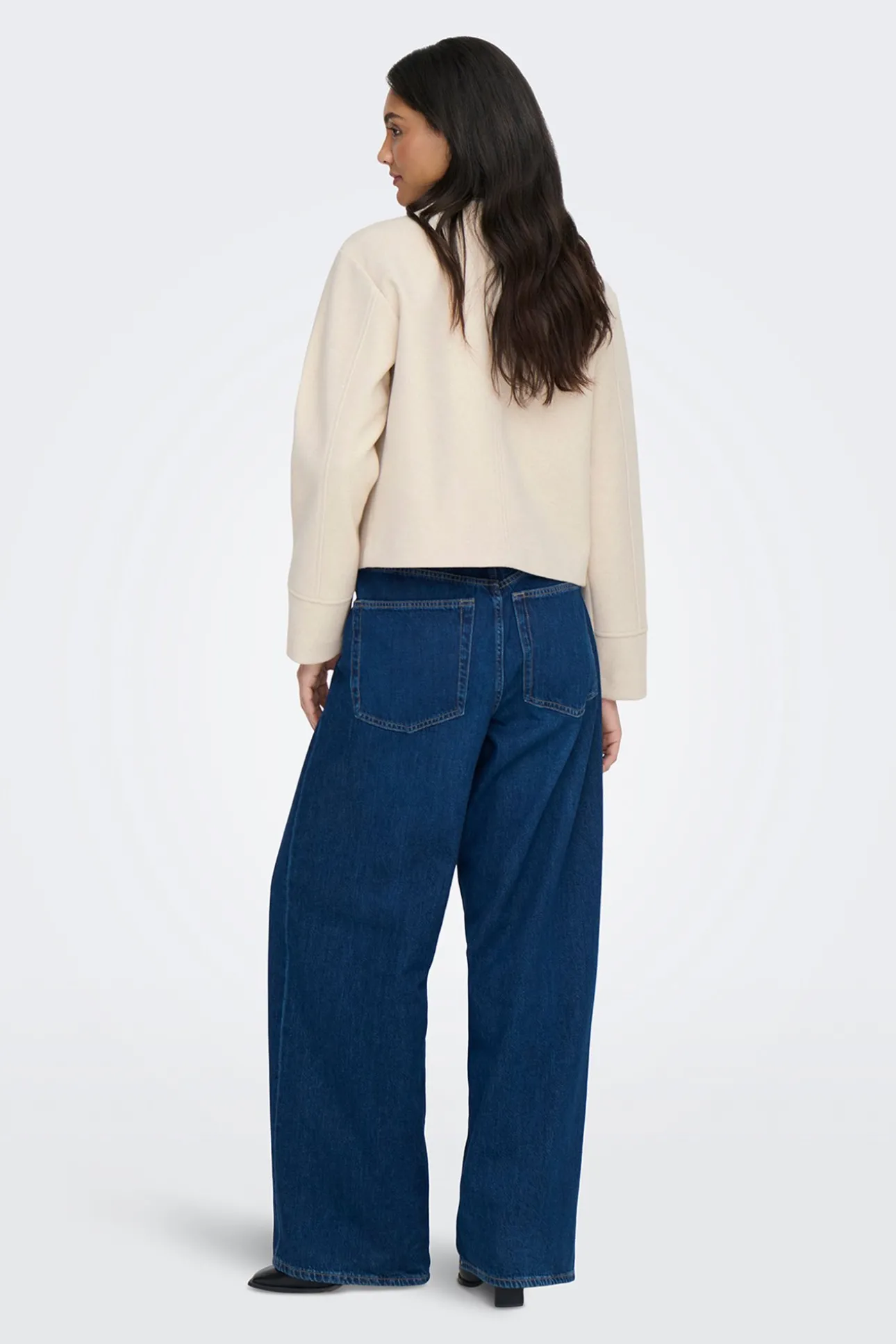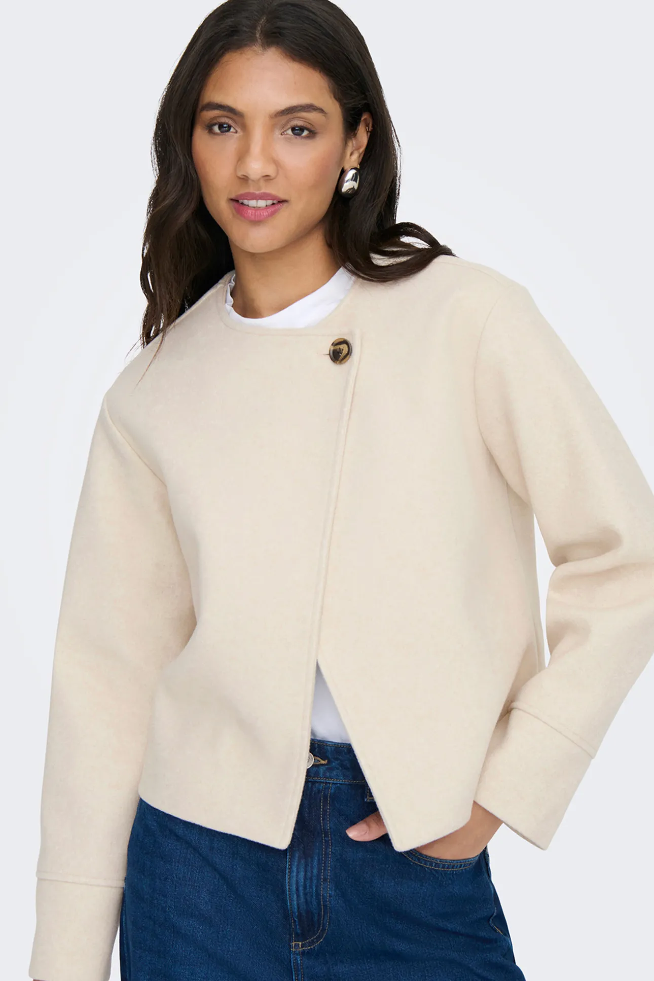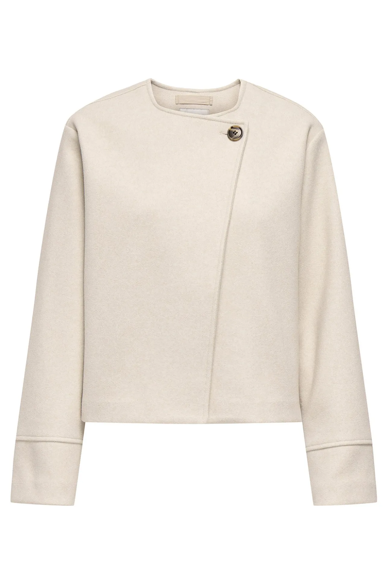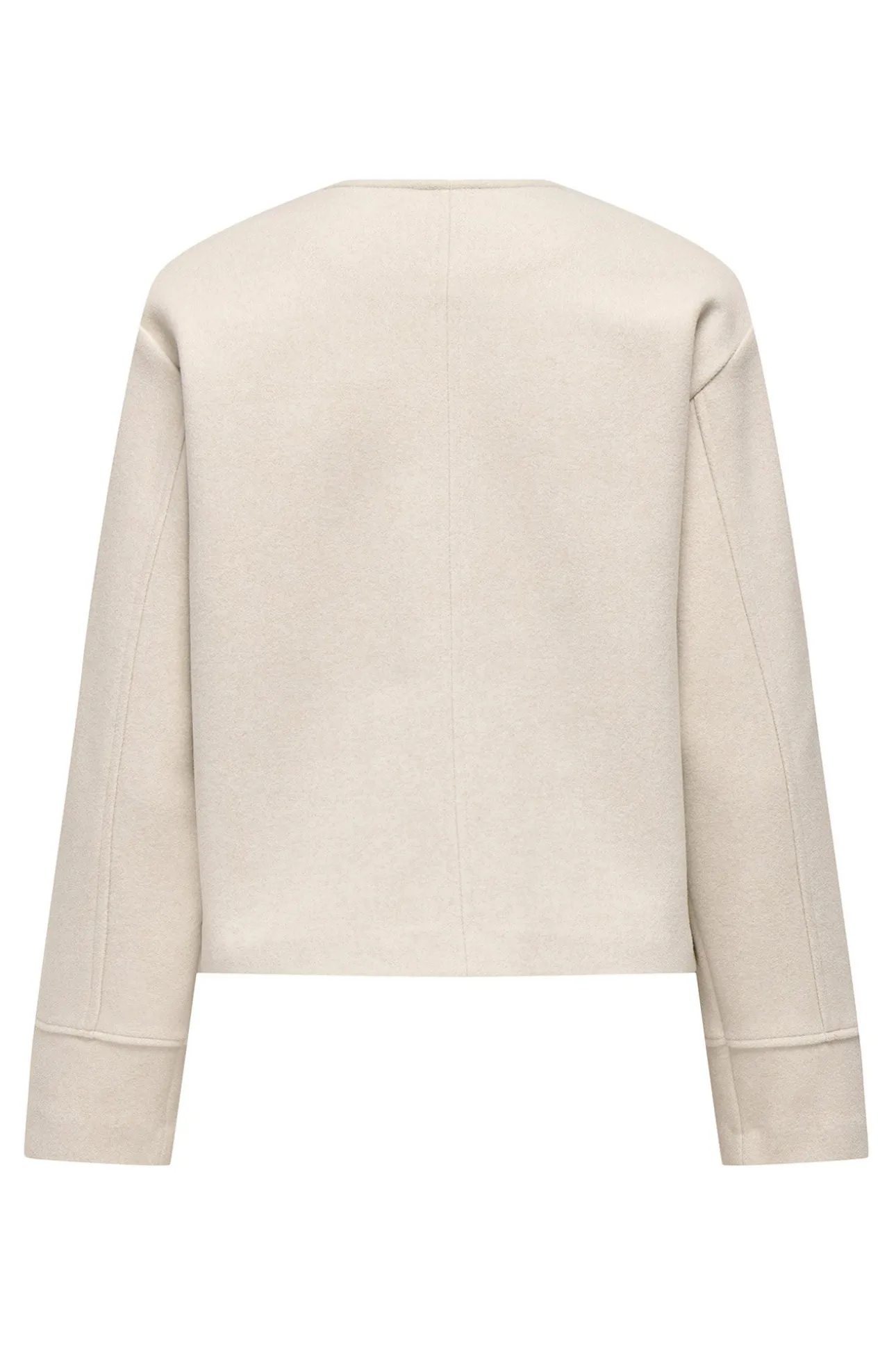 – Corte recto, manga larga, cuello redondo y cierre de botón superior.