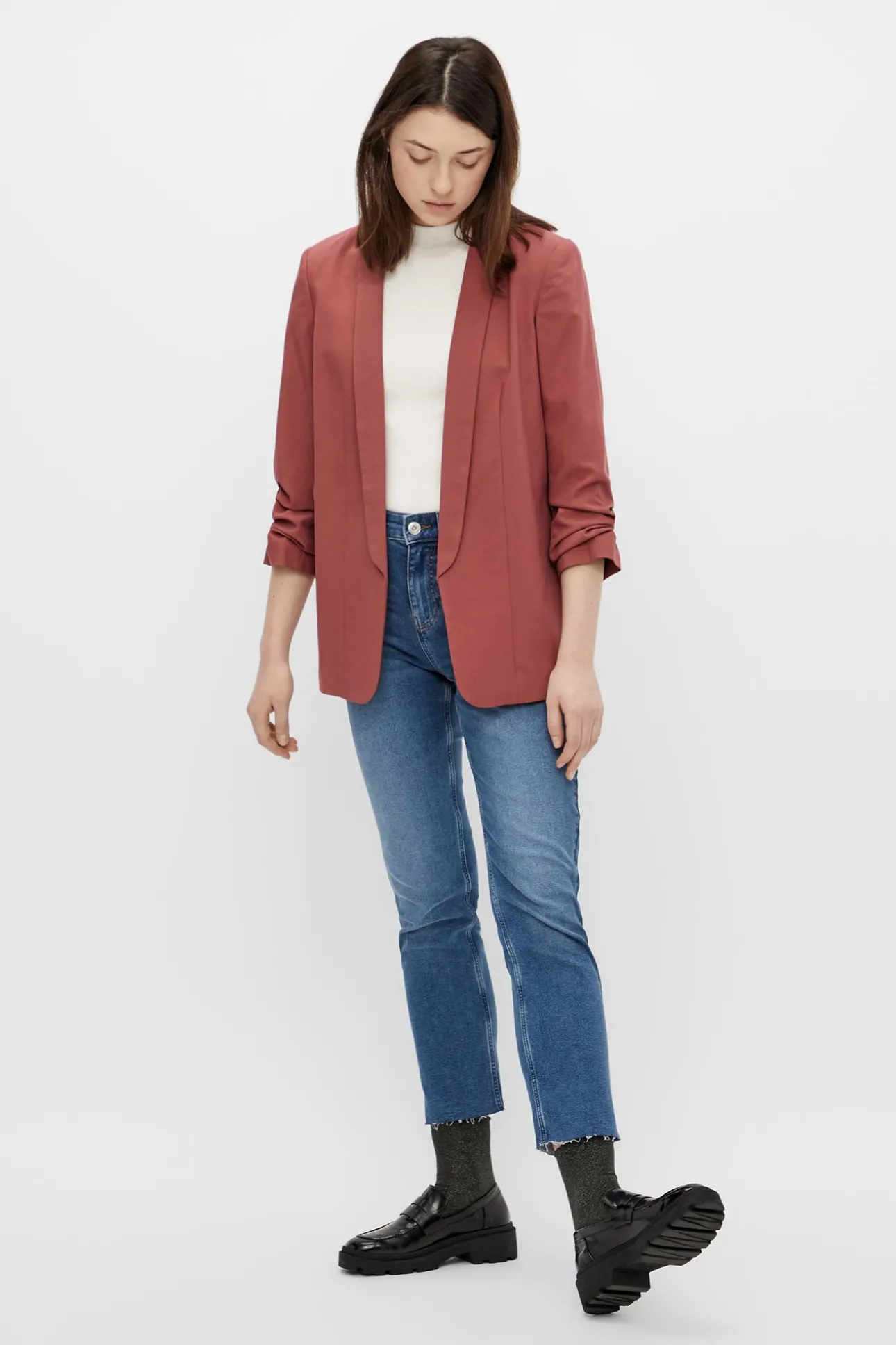 Americana manga 3/4 con detalle solapa y manga fruncida. Sin botones.