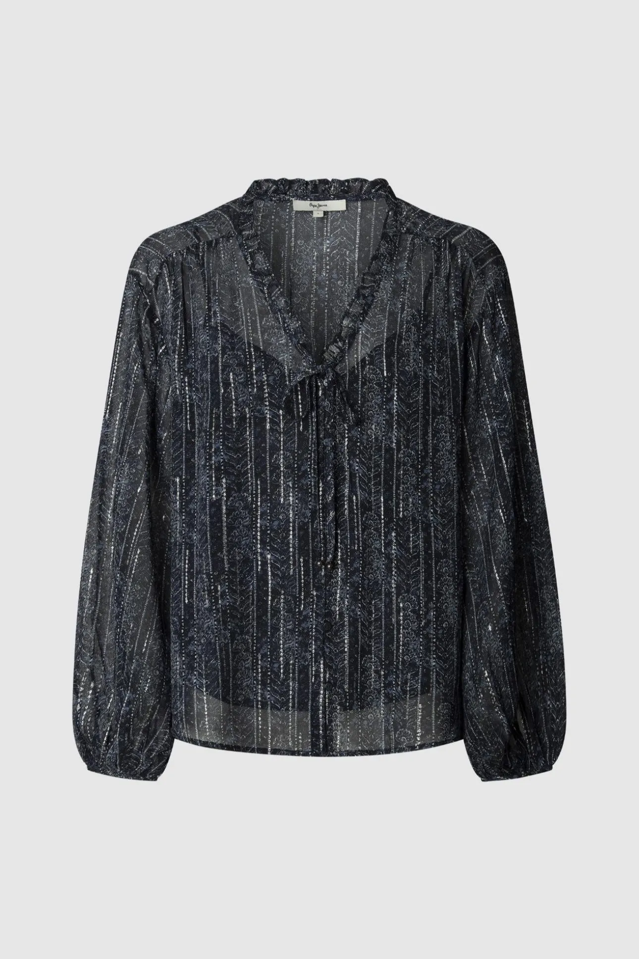 – Cuello pico con minivolantes y lazo en el escote