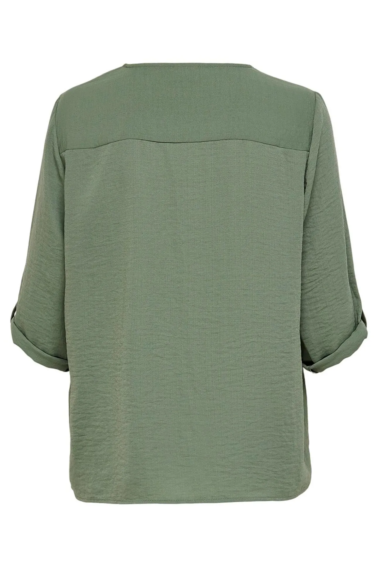 Camisa holgada con escote en V, manga 3/4 y detalle de trabilla con botón en los puños.