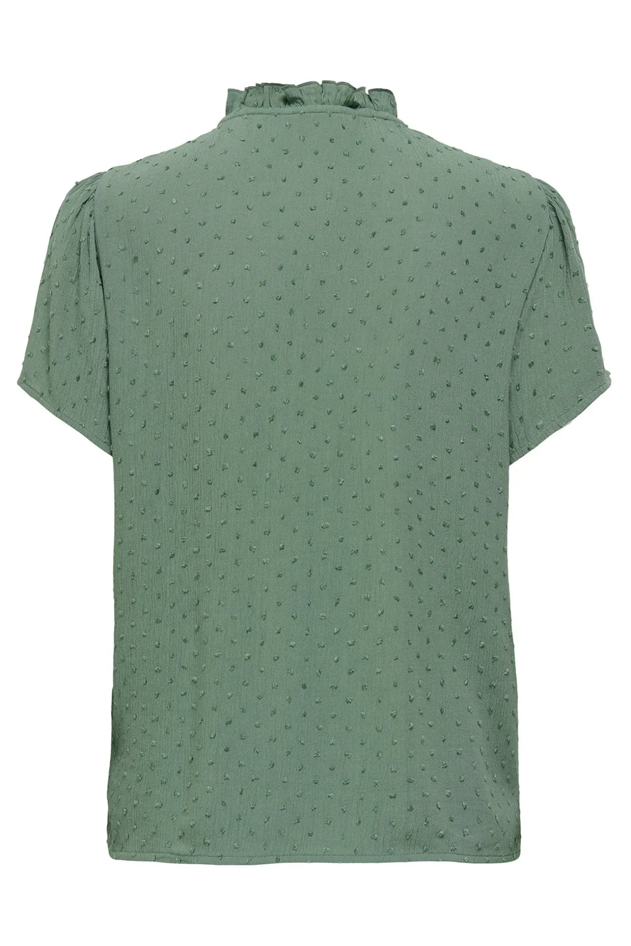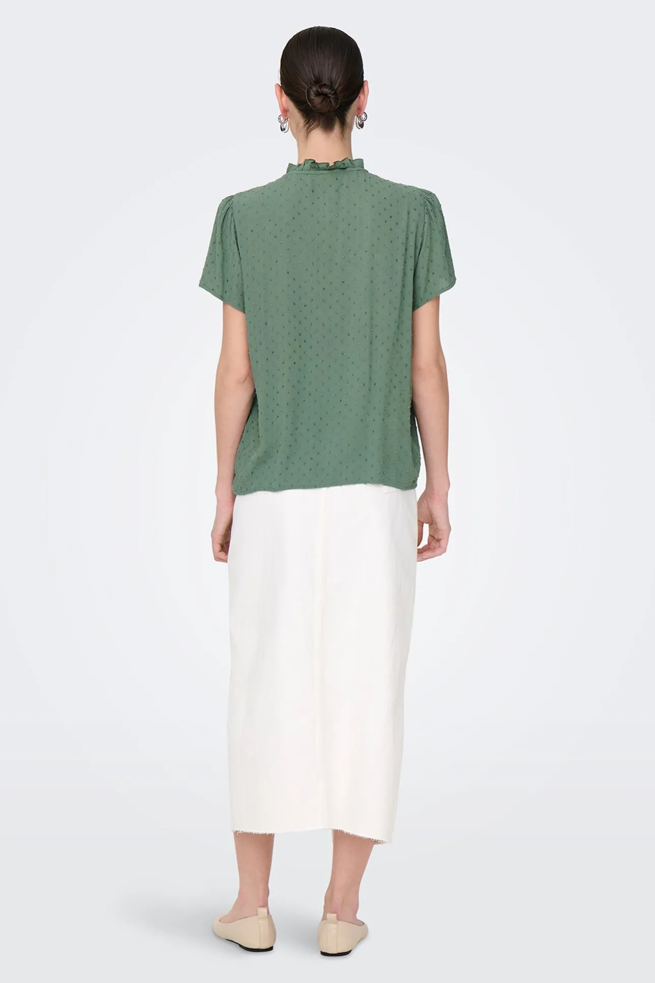 – Corte suelto, cuello perkins ondulado con abertura y cierre de lazo y manga ligeramente abullonada.