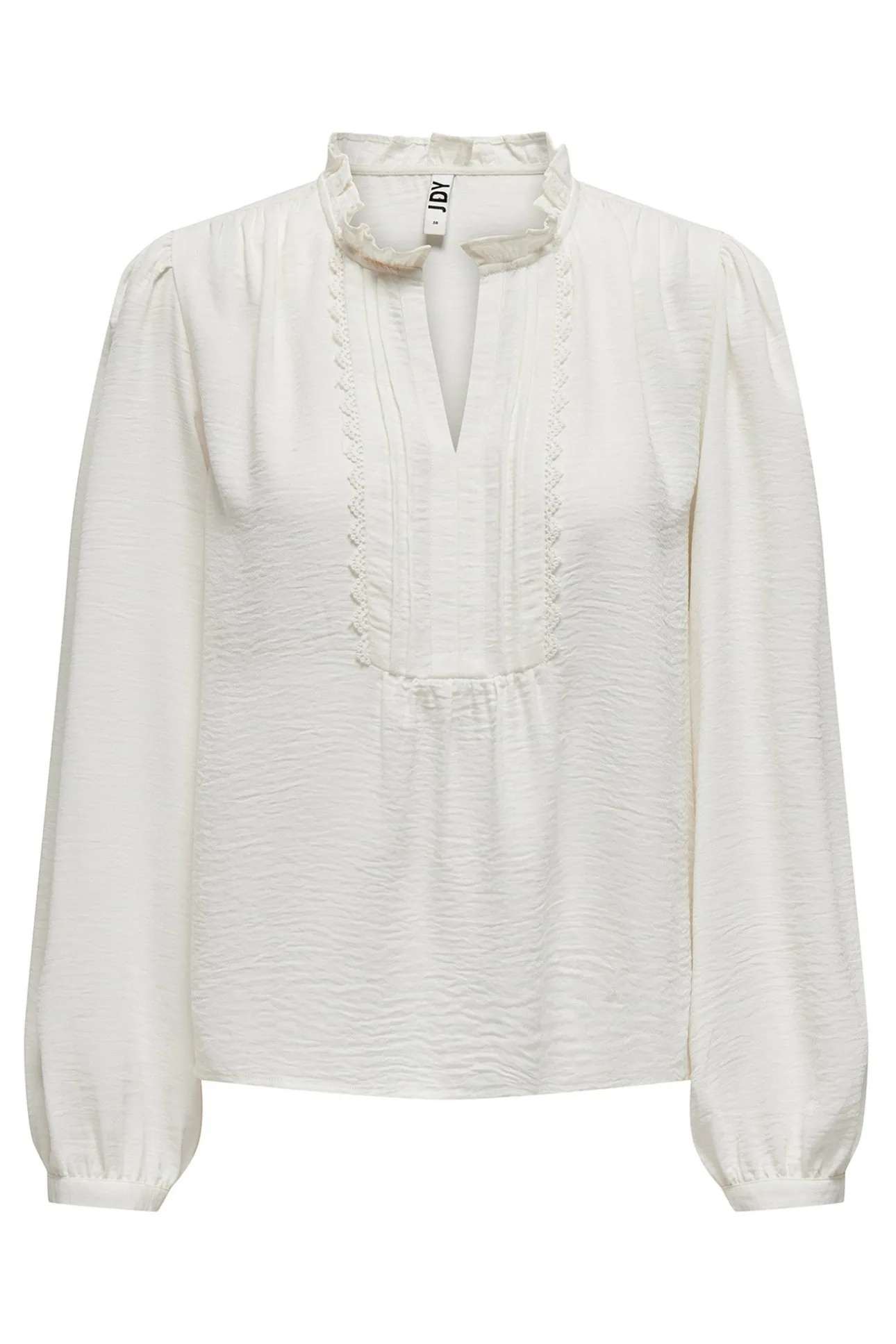 – Cuello perkins abierto en pico, manga ligeramente abullonada, cierre de botones delantero y detalles de puntilla.