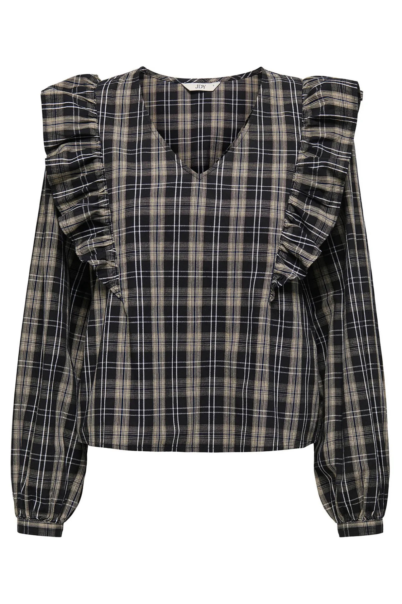 – Corte holgado, cuello pico, manga abullonada con puños ajustados y estampado de cuadros.