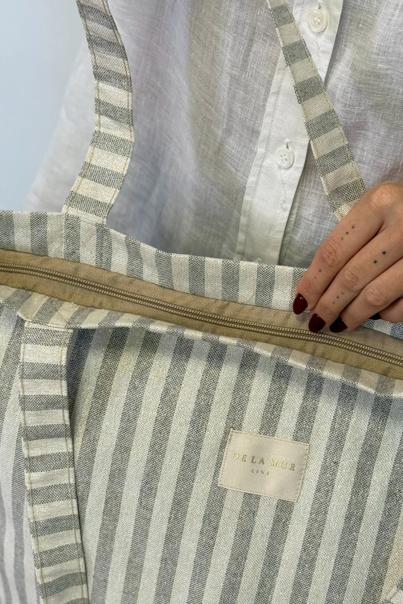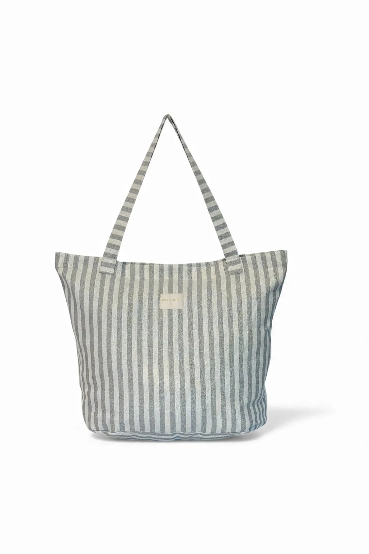 Bolsa shopper grande con asas para llevar al hombro. Con tejido fino de half-panama 80% algodón y 20% poliéster con estampado a rayas en tono gris con lurex. Etiqueta de marca con lurex dorado. Con cremallera en la parte superior. Para su correcto mantenimiento se aconseja lavarlo en frío a mano y no utilizar la secadora.