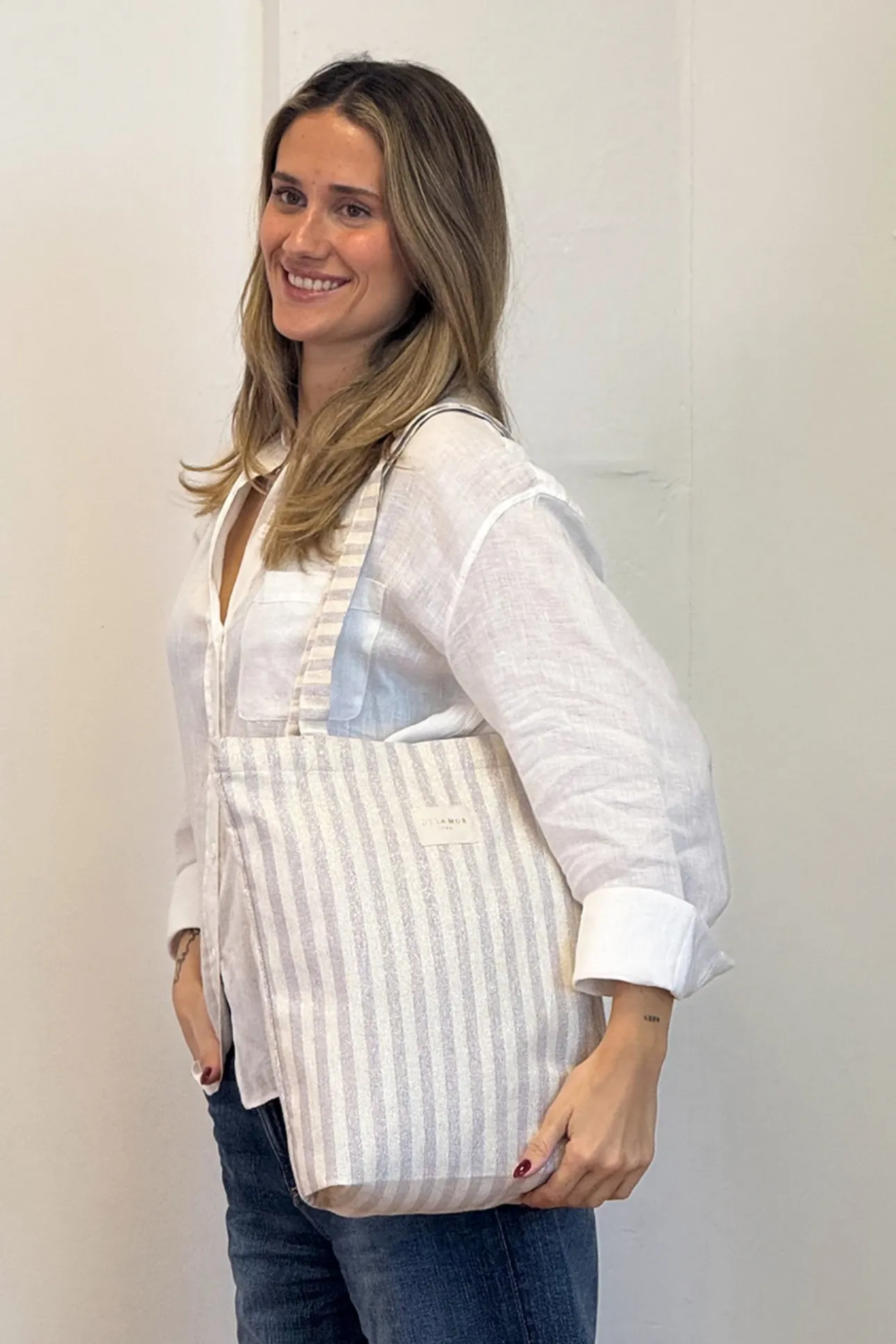 Ideal para llevar libretas, agenda, alguna prenda de ropa, muy cómoda para el día a día. Tiene una capacidad pequeña, aunque caben bastantes cosas. La tote bag de toda la vida. Su tejido con lúrex aporta ese toque de brillo que eleva cualquier look, incluso en los días más sencillos.