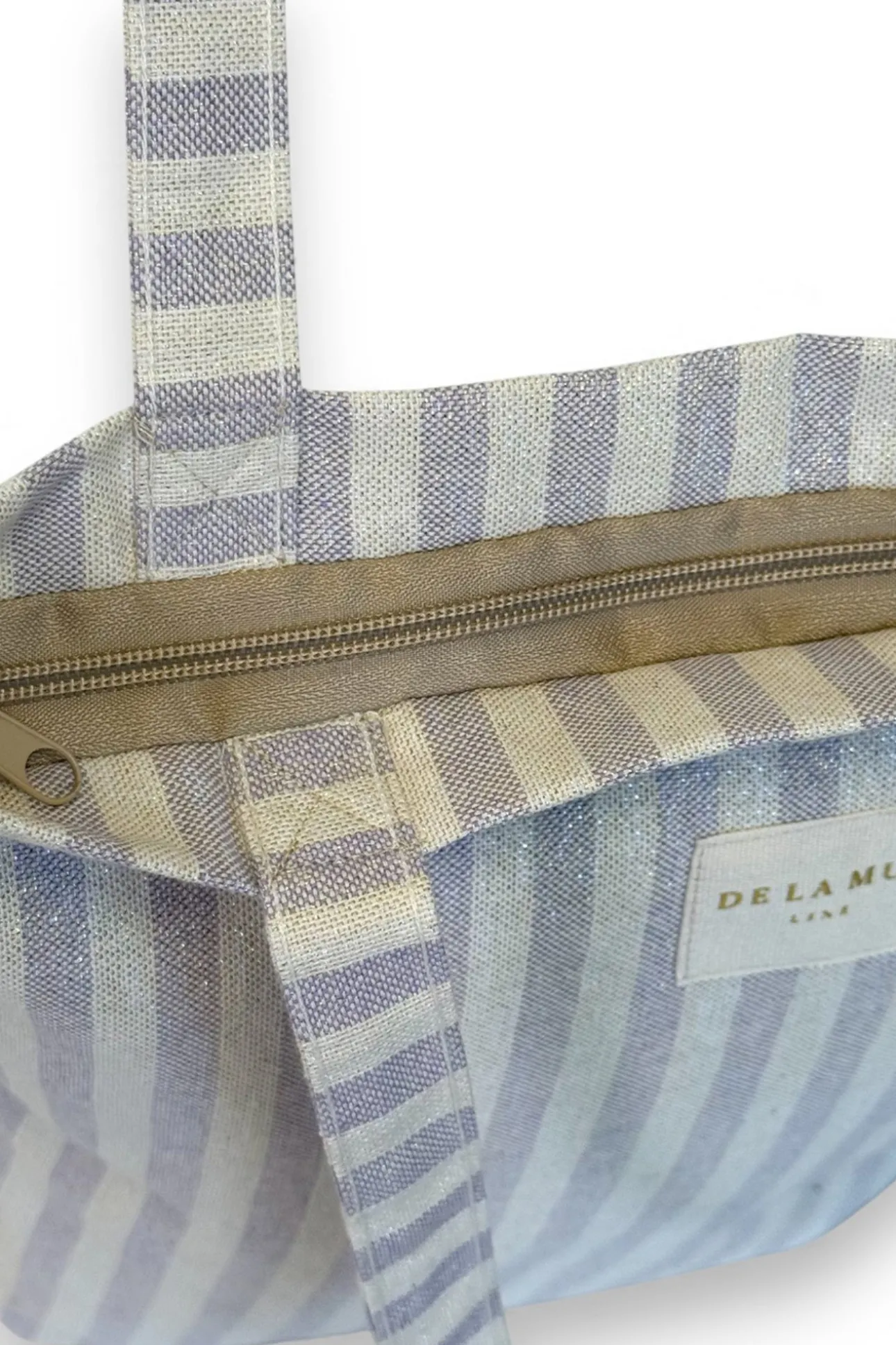 Bolsa «tote bag» con asas para llevar al hombro. Con tejido fino de half-panama 80% algodón y 20% poliéster con estampado a rayas de color lila con lurex. Etiqueta de marca con lurex dorado. Con cremallera en la parte superior. Para su correcto mantenimiento se aconseja lavarlo en frío y no utilizar secadora.