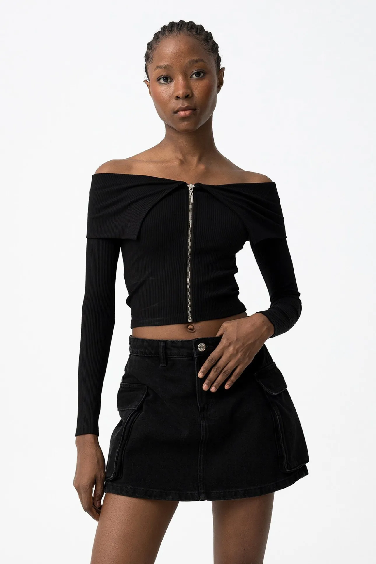 Camiseta super slim fit de canalé, con cremallera, escote barco, manga larga y bajo cropped.