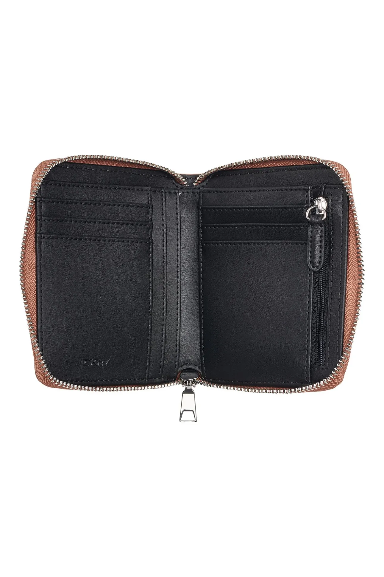 Cartera con cierre de cremallera y logotipo DKNY centrado a todo en el frente. Con compartimento interior para tarjetas y monedas.