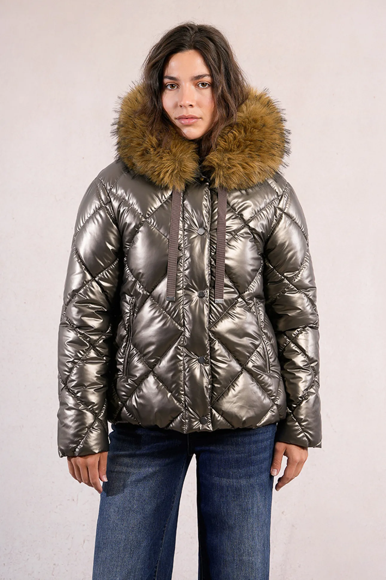 – Modelo en tejido brillante, bolsillos al bies y capucha