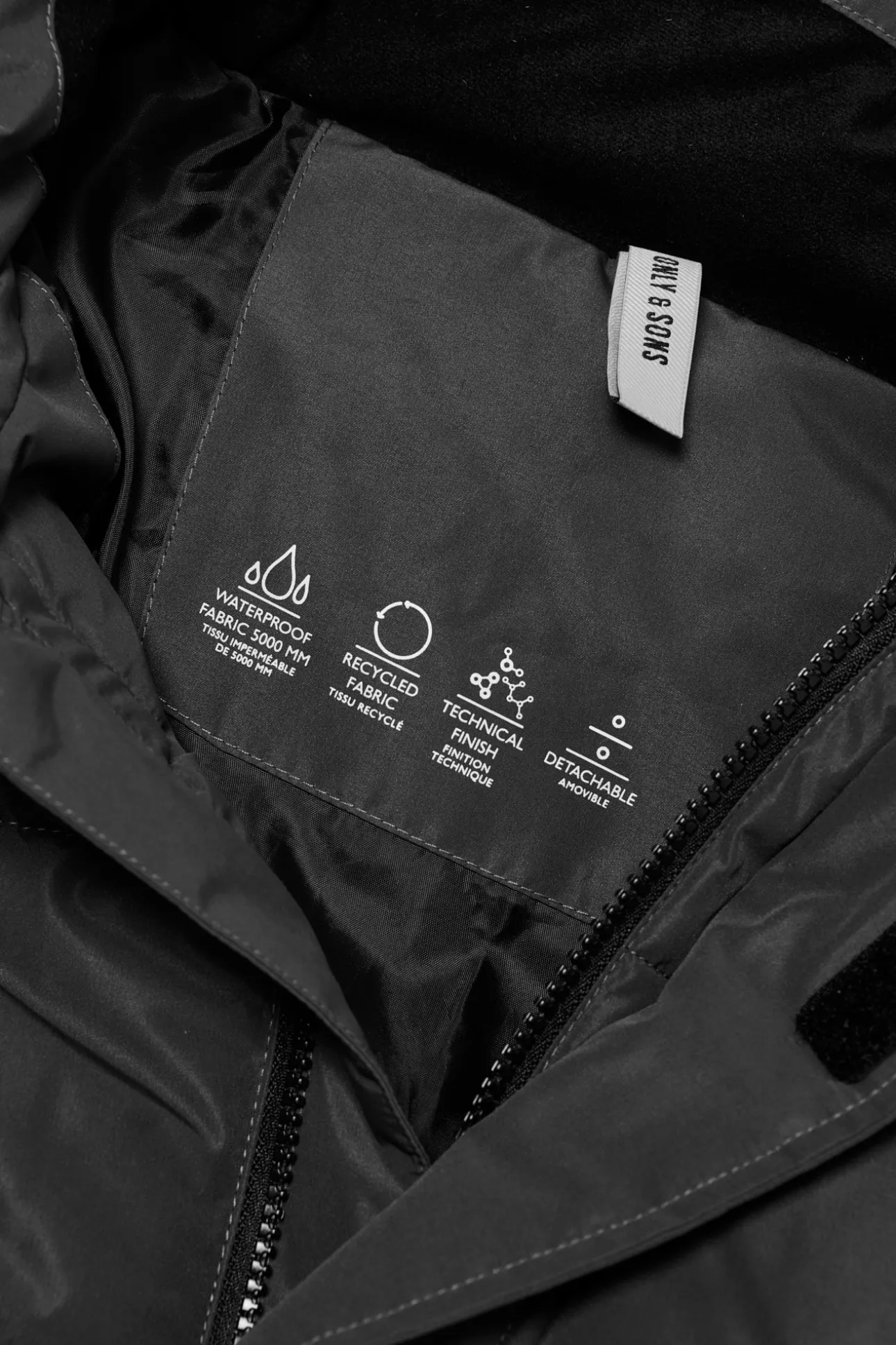 – Corte recto, manga larga, cuello alto, puños elásticos, cierre de cremallera frontal y bolsillos laterales.