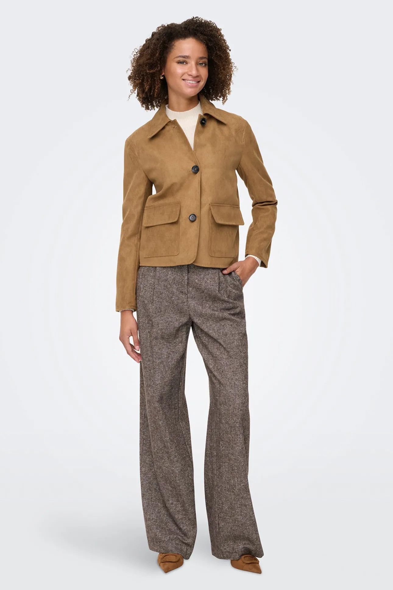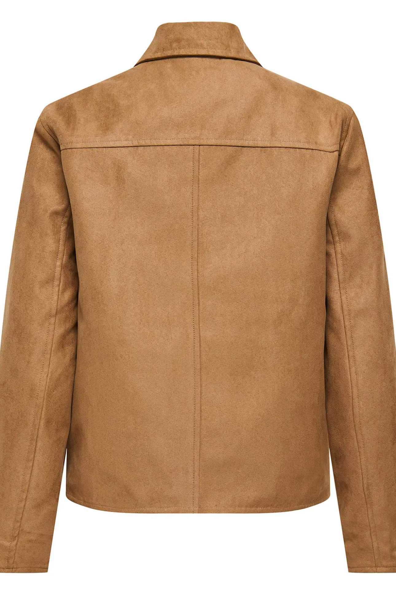 – Corte recto, cuello clásico, cierre de botones delantero y bolsillos frontales con solapas.