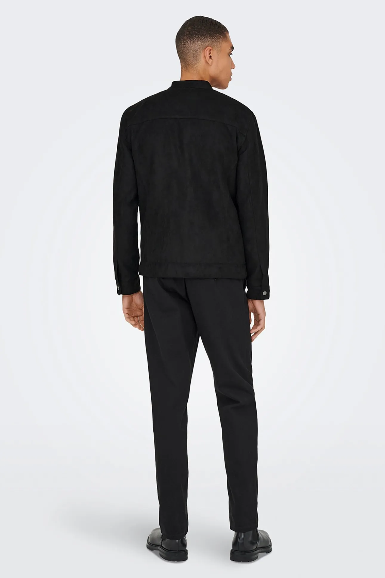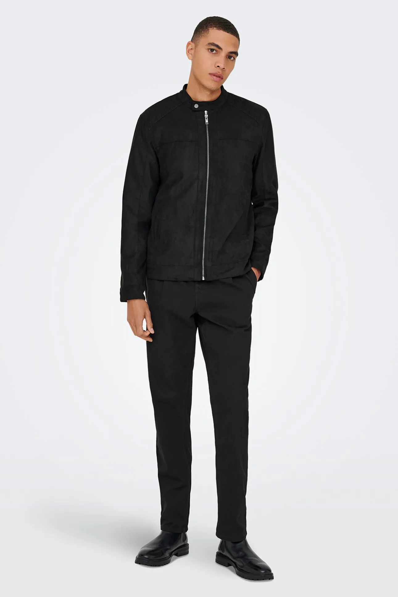 – Corte ajustado, cuello mao con broche metálico, cierre de cremallera frontal y bolsillos laterales.