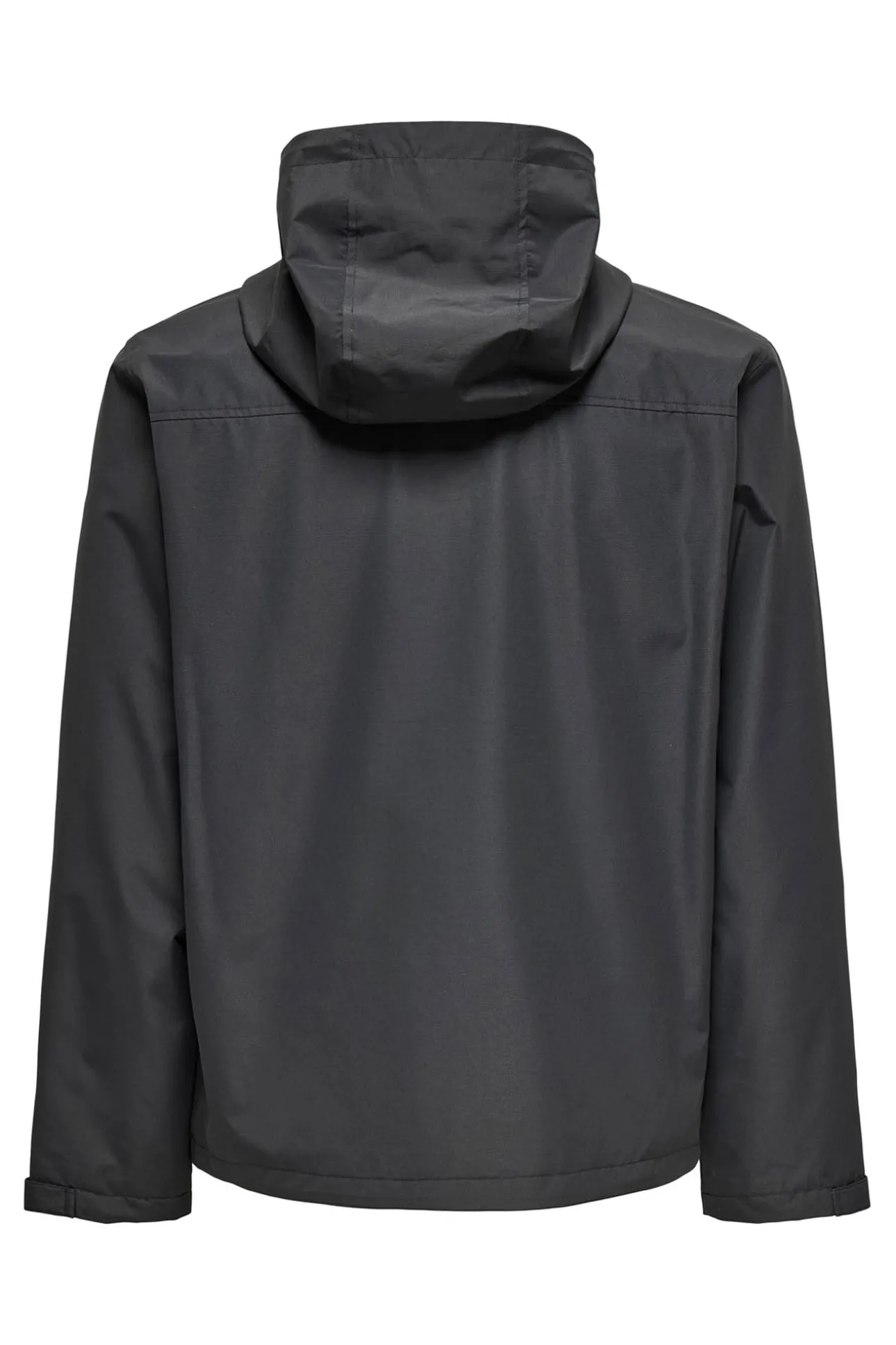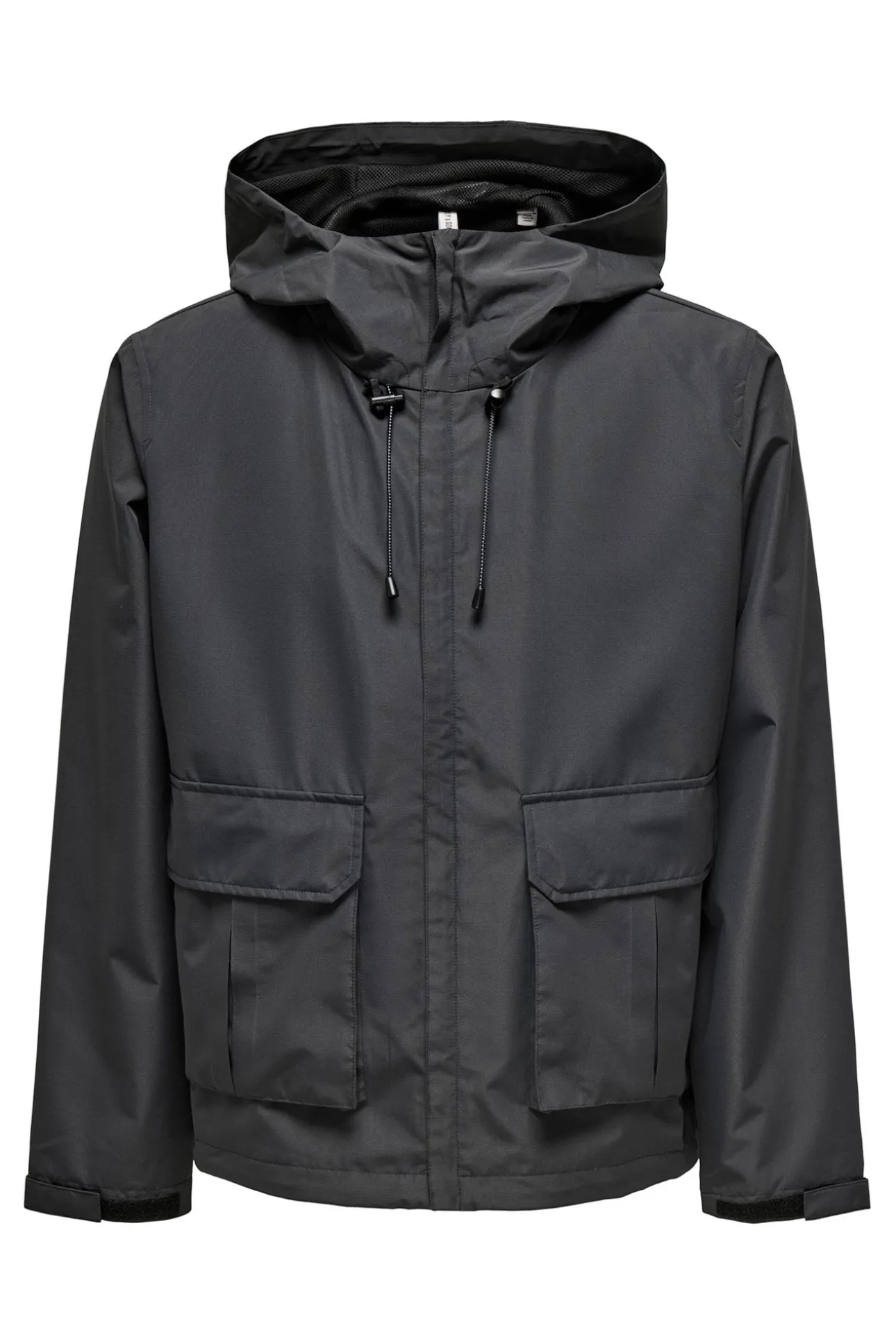 – Corte recto, cierre de cremallera frontal, bolsillos frontales interiores con solapa y capucha ajustable con cordones.